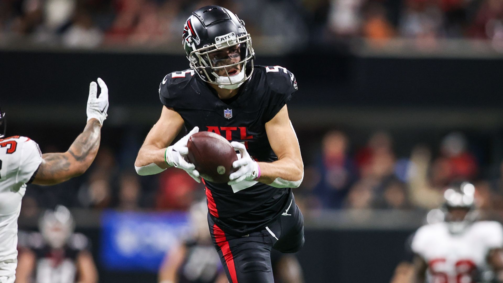 Dec 10, 2023; Atlanta, Georgia, USA; Atlanta Falcons wide receiver Drake London (5) catches a pass against the Tampa Bay Buccaneers in the second half at Mercedes-Benz Stadium. Mandatory Credit: Brett Davis-USA TODAY Sports