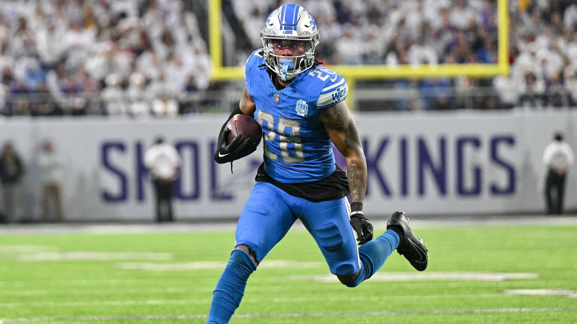 Dec 24, 2023; Minneapolis, Minnesota, USA; Detroit Lions running back Jahmyr Gibbs (26) runs the ball against the Minnesota Vikings at U.S. Bank Stadium. Mandatory Credit: Jeffrey Becker-USA TODAY Sports