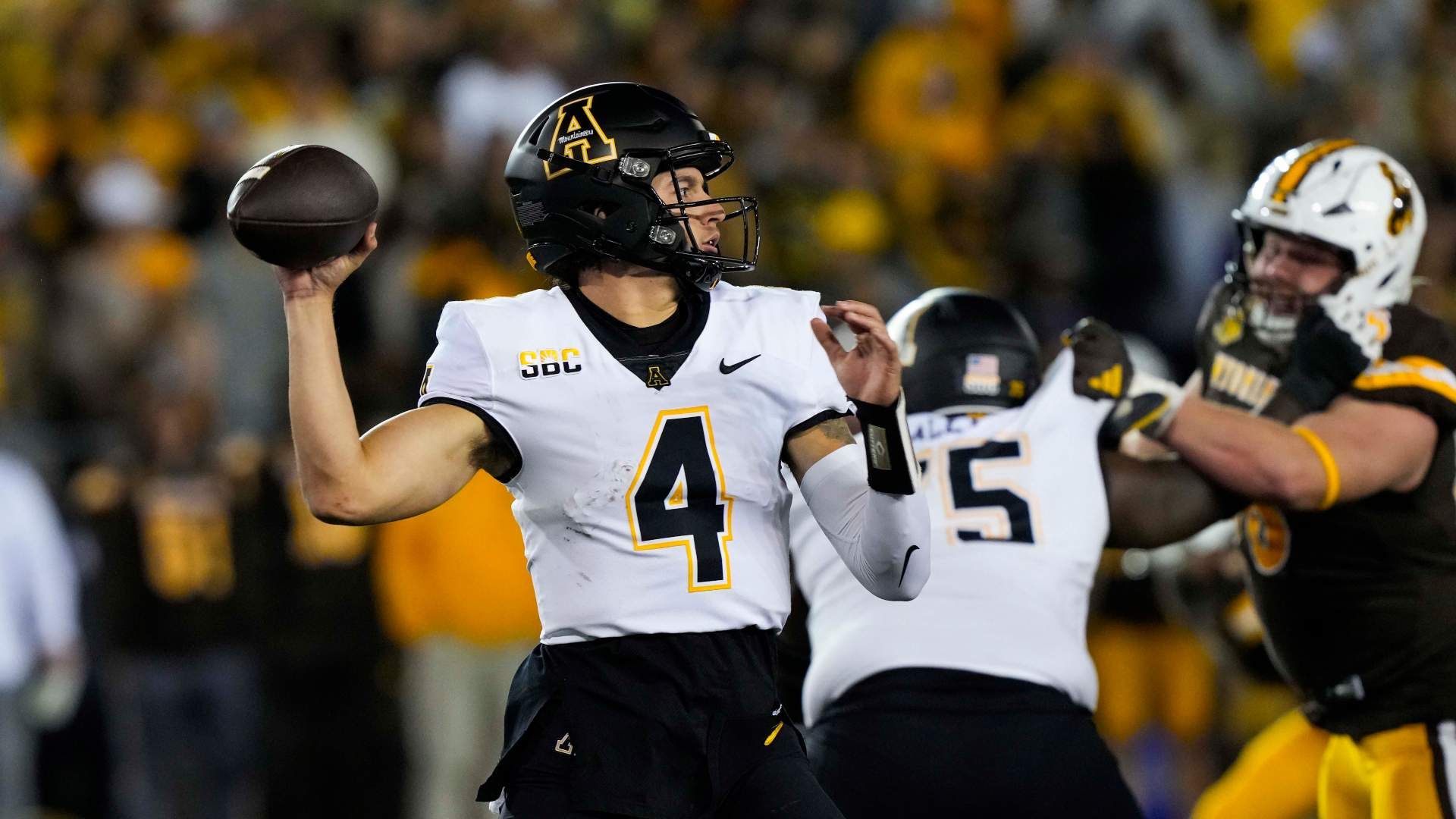 Sep 23, 2023; Laramie, Wyoming, USA; Appalachian State Mountaineers quarterback Joey Aguilar (4) looks to throw against the Wyoming Cowboys during the third quarter at Jonah Field at War Memorial Stadium. Mandatory Credit: Troy Babbitt-USA TODAY Sports