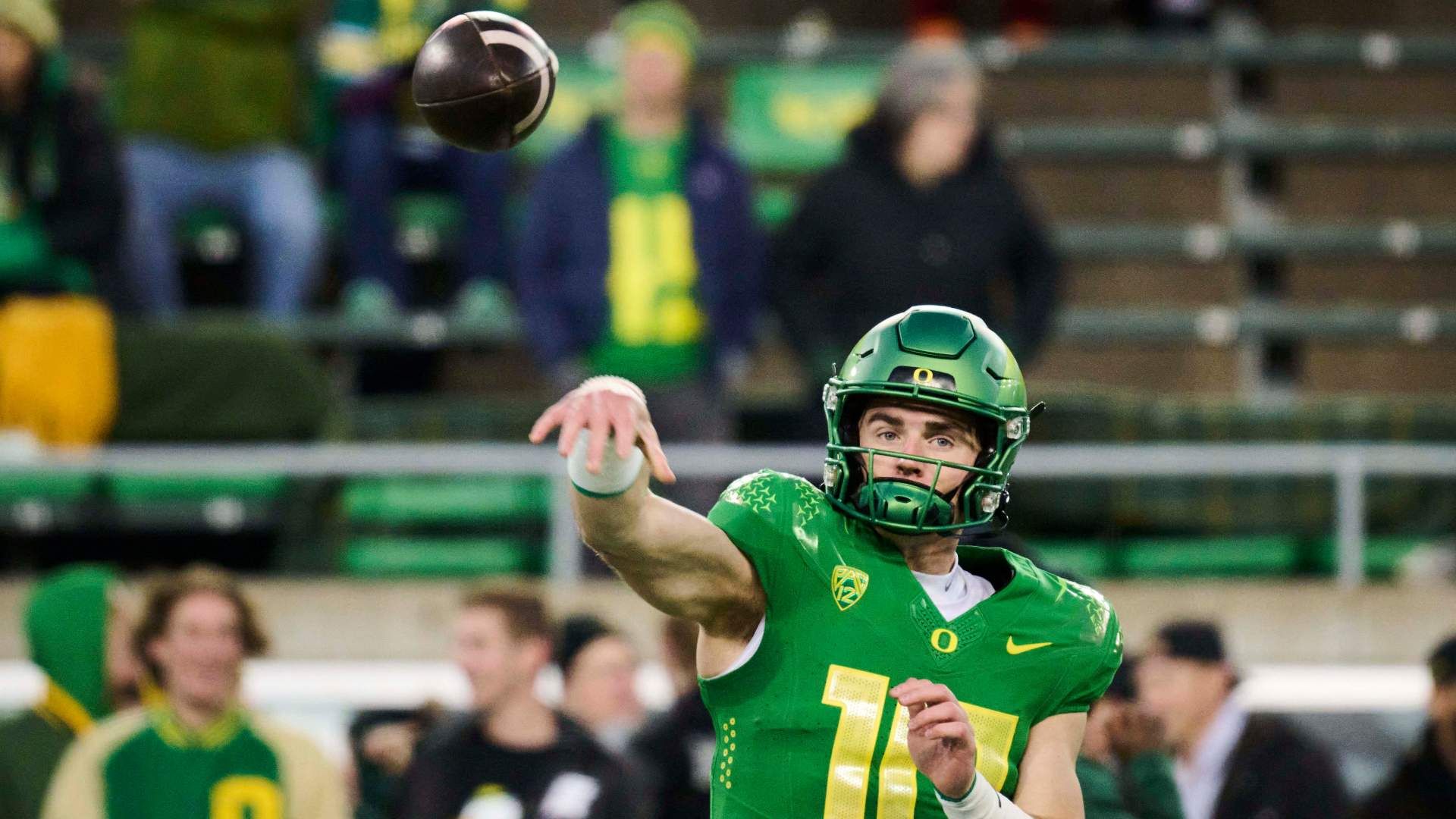 Nov 24, 2023; Eugene, Oregon, USA; Oregon Ducks quarterback Bo Nix (10) warms up before a game against the Oregon State Beavers at Autzen Stadium. Mandatory Credit: Troy Wayrynen-USA TODAY Sports