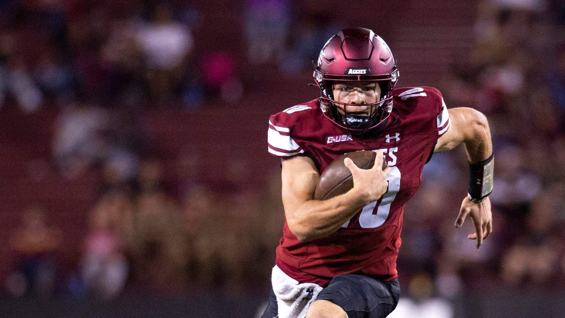 Aggie quarterback Diego Pavia runs the ball during a NMSU football game on Wednesday, Oct. 11, 2023, at the Aggies Memorial Stadium. Photo Credit: Meg Potter/Sun-News / USA TODAY NETWORK