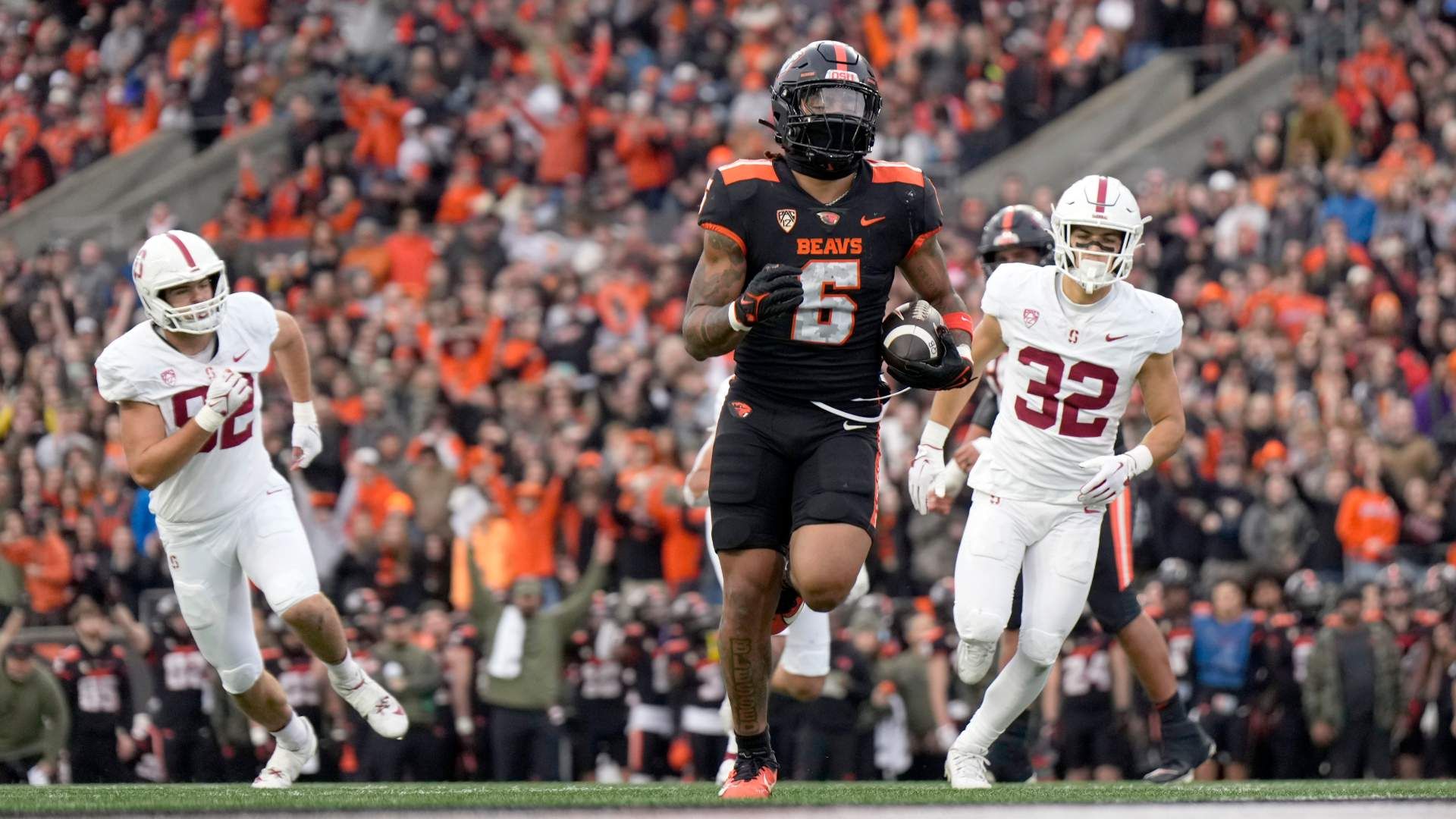 Nov 11, 2023; Corvallis, Oregon, USA; Oregon State Beavers running back Damien Martinez (6) runs with the ball for a touchdown during the first half against the Stanford Cardinal at Reser Stadium. Mandatory Credit: Soobum Im-USA TODAY Sports