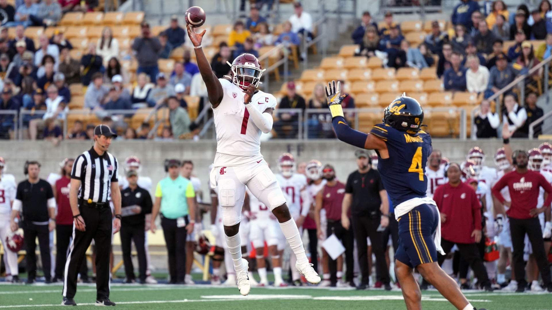 Nov 11, 2023; Berkeley, California, USA; Washington State Cougars quarterback Cameron Ward (1) throws a touchdown pass against California Golden Bears defensive back Kaylin Moore (4) during the fourth quarter at California Memorial Stadium. Mandatory Credit: Darren Yamashita-USA TODAY Sports