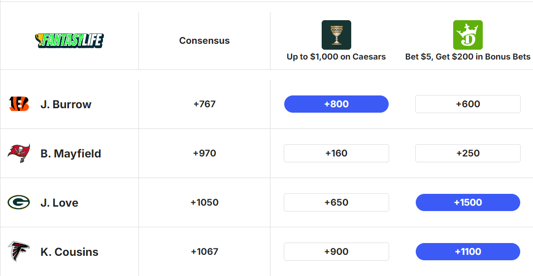 Mayfield lost his leading receiver for the season last week, Chris Godwin, and won’t have perennial TD magnet Mike Evans back for at least two games, and potentially longer. TDs are an extremely volatile stat, so I don’t mind going further back in this category and looking at Jordan Love, whose odds got pushed up to +1500, after he suffered a groin injury against the Jaguars.