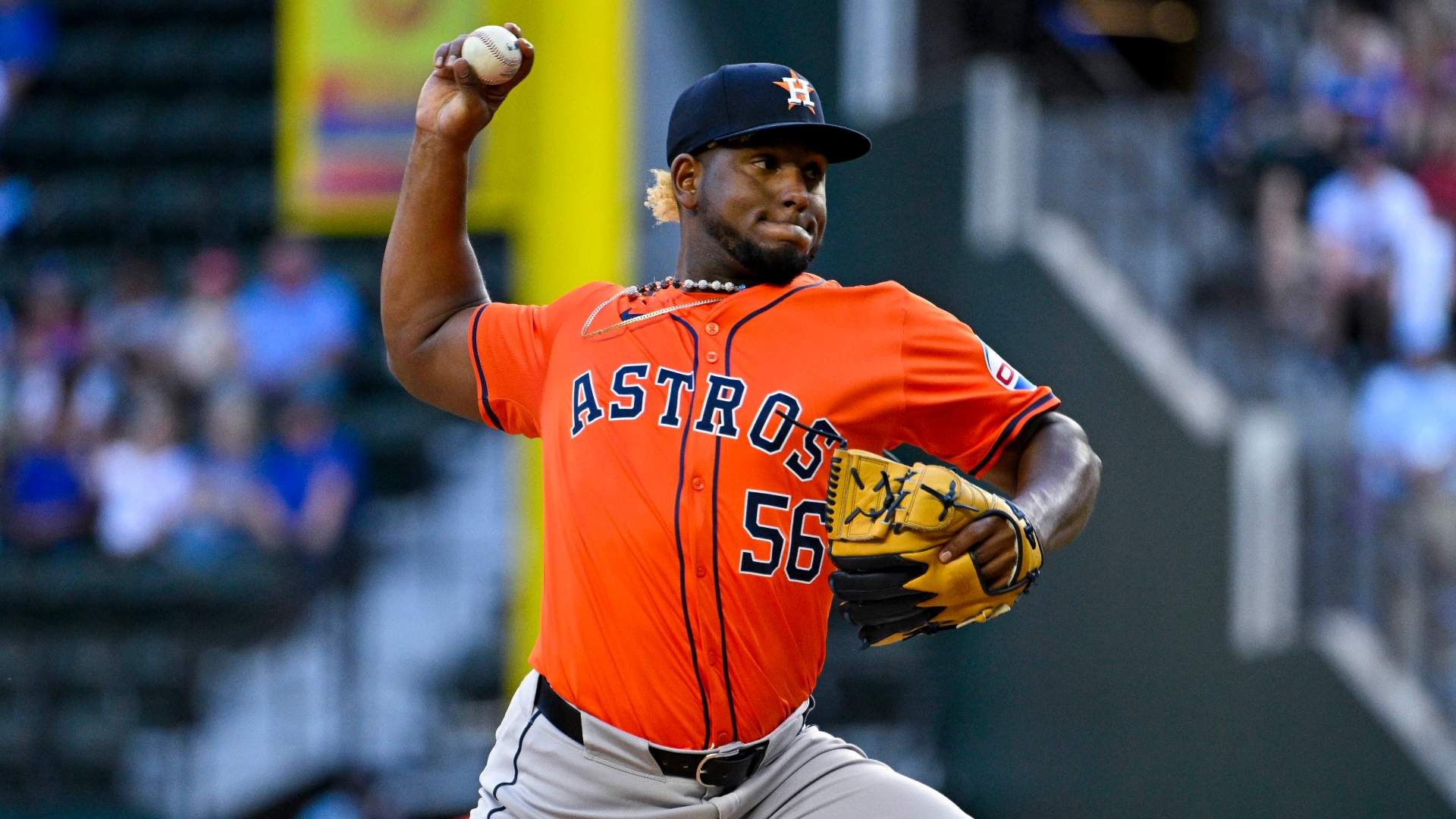 Apr 7, 2024; Arlington, Texas, USA; Houston Astros starting pitcher Ronel Blanco (56) pitches against the Texas Rangers during the first inning at Globe Life Field. Mandatory Credit: Jerome Miron-USA TODAY Sports