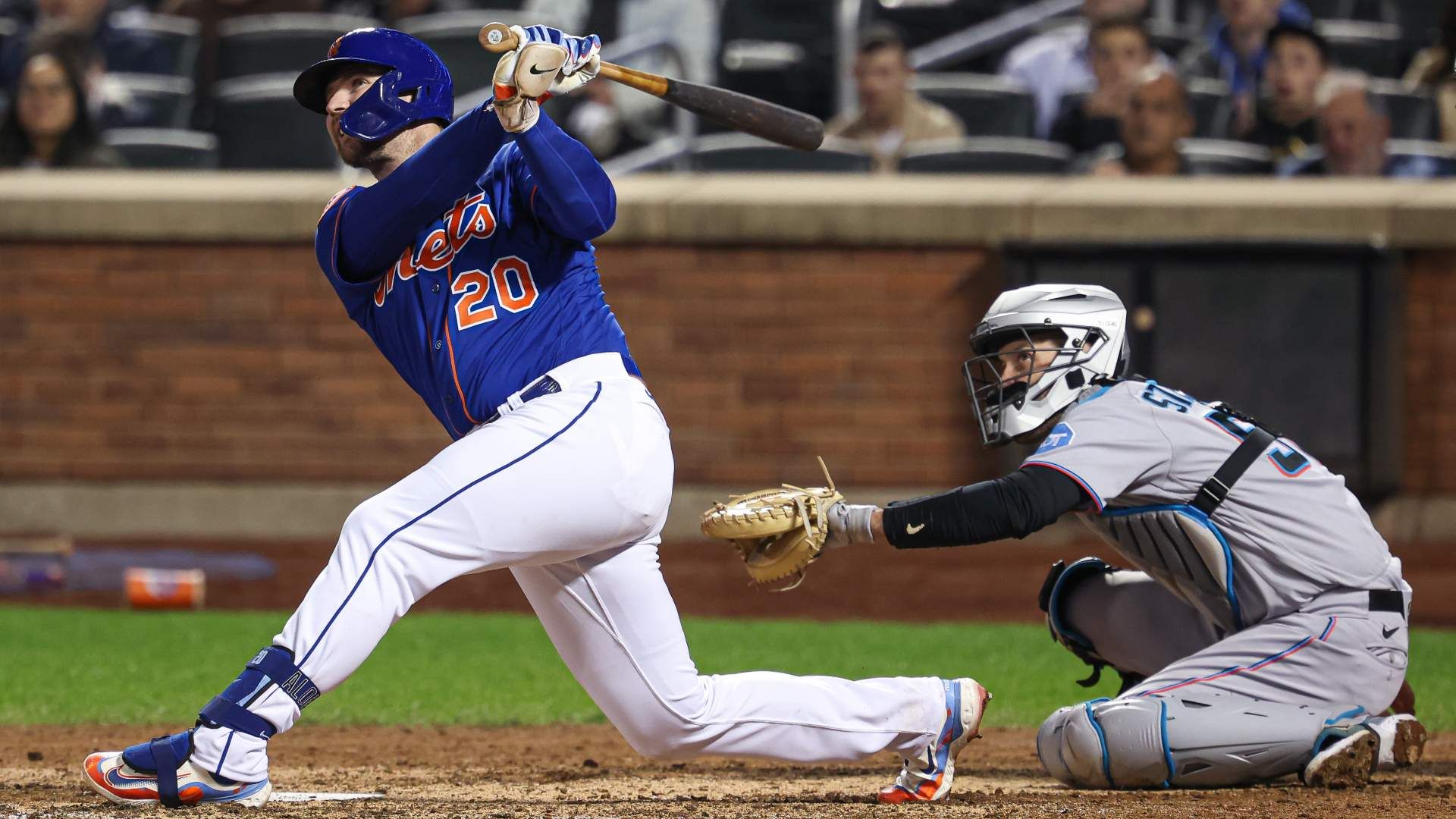 Sep 27, 2023; New York, NY, USA; New York Mets first baseman Pete Alonso (20) doubles during the eighth inning in front of Miami Marlins catcher Jacob Stallings (58) at Citi Field. Mandatory Credit: Vincent Carchietta-USA TODAY Sports