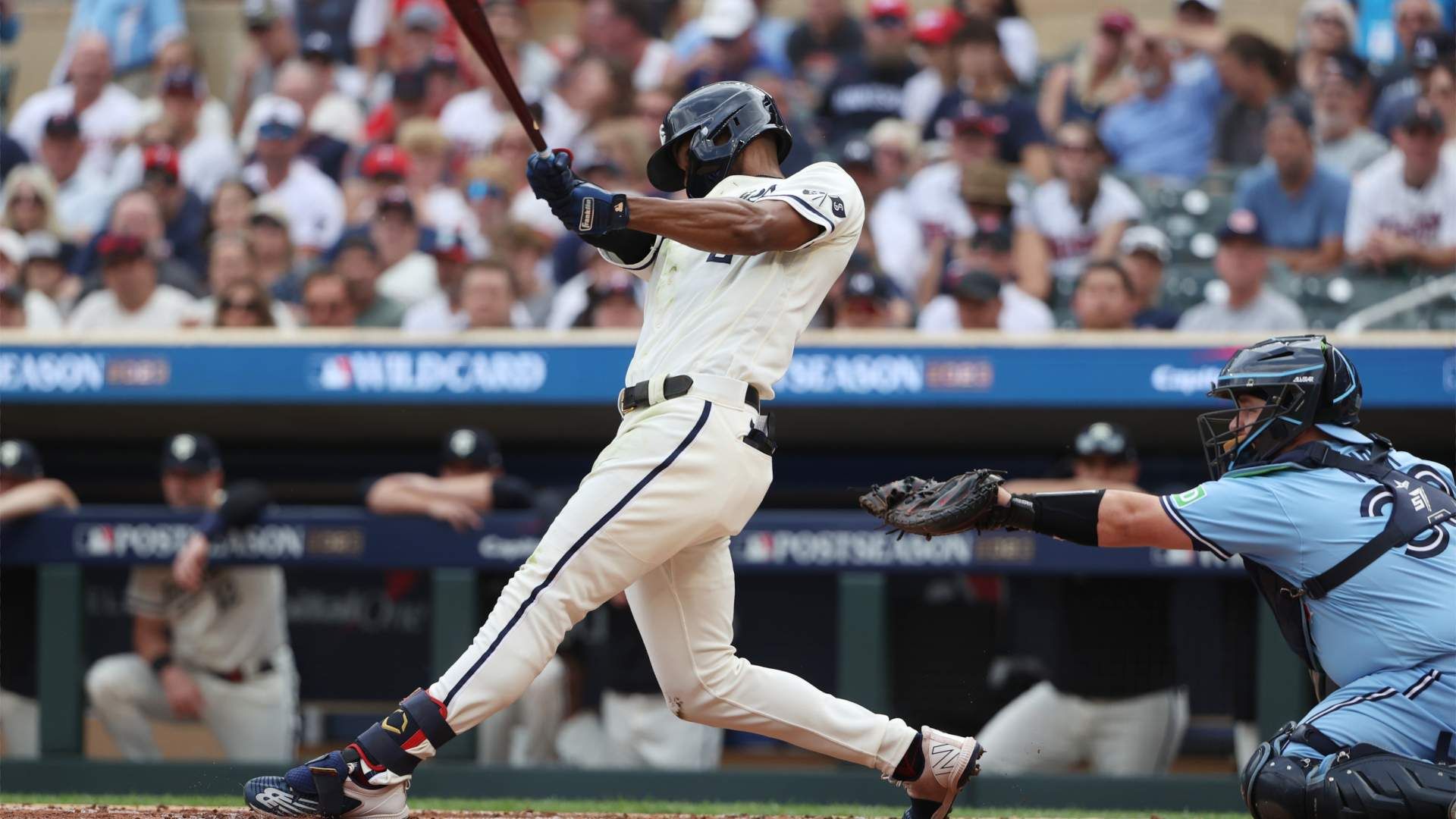 Oct 3, 2023; Minneapolis, Minnesota, USA; Minnesota Twins center fielder Michael A. Taylor (2) hits a single in the second inning against the Toronto Blue Jays during game one of the Wildcard series for the 2023 MLB playoffs at Target Field. Mandatory Credit: Jesse Johnson-USA TODAY Sports