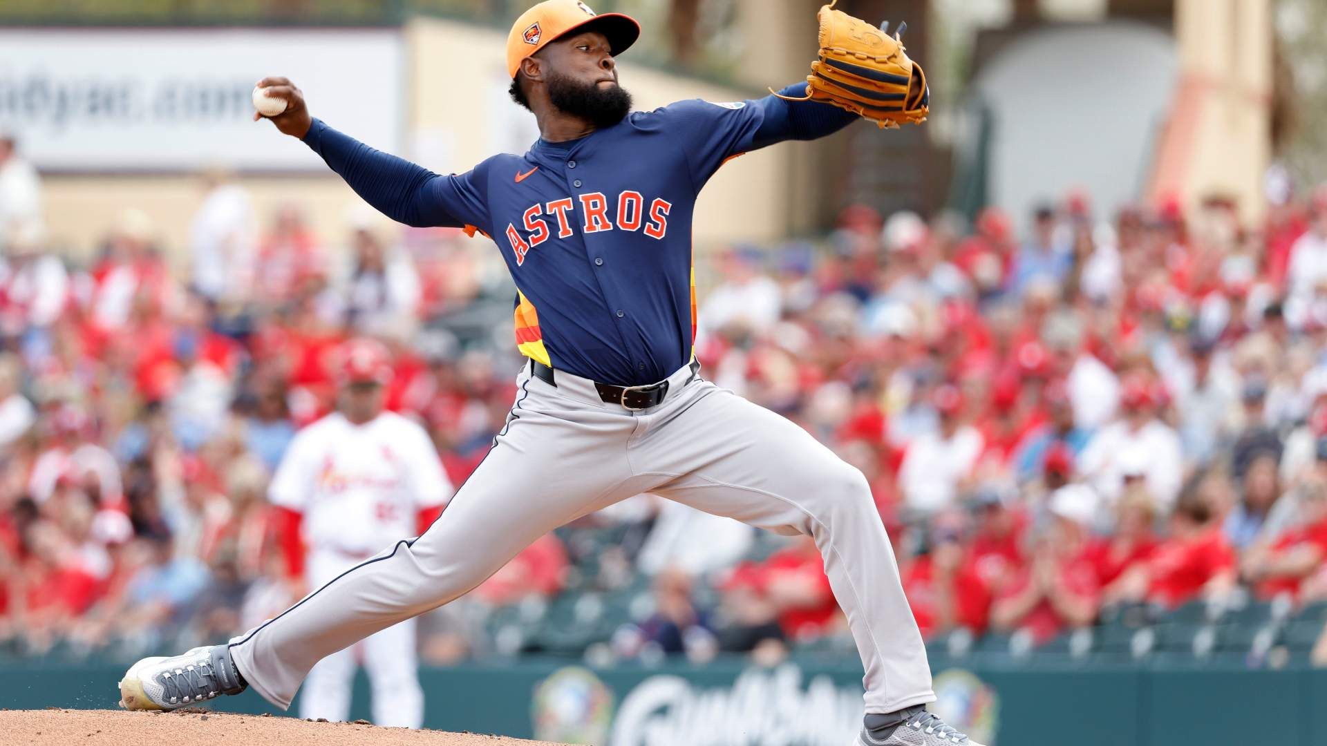 Mar 7, 2024; Jupiter, Florida, USA; Houston Astros starting pitcher Cristian Javier (53) pitches against the St. Louis Cardinals in the first inning at Roger Dean Chevrolet Stadium. Mandatory Credit: Rhona Wise-USA TODAY Sports