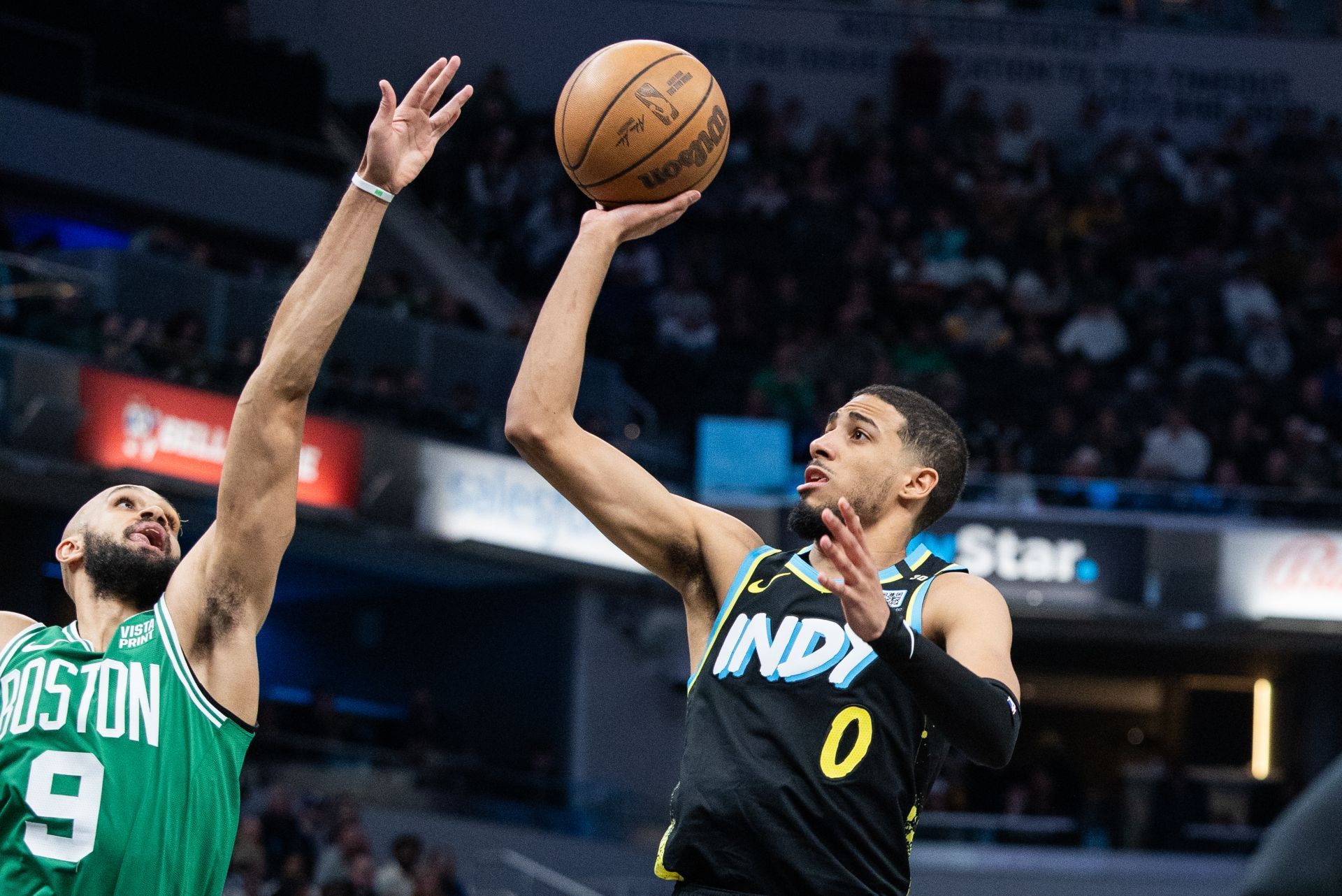 Jan 6, 2024; Indianapolis, Indiana, USA; Indiana Pacers guard Tyrese Haliburton (0) shoots the ball against Boston Celtics guard Derrick White (9) in the second half at Gainbridge Fieldhouse. Mandatory Credit: Trevor Ruszkowski-USA TODAY Sports
