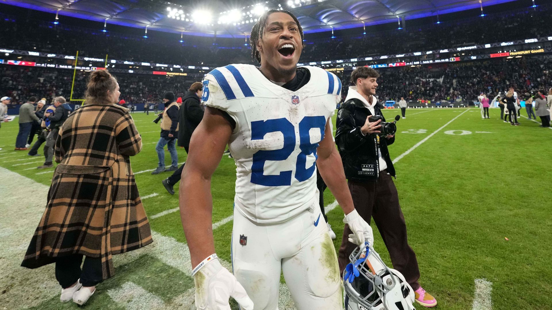 Nov 12, 2023; Frankfurt, Germany; Indianapolis Colts running back Jonathan Taylor (28) celebrates after an NFL International Series game against the New England Patriots at Deutsche Bank Park. Mandatory Credit: Kirby Lee-USA TODAY Sports