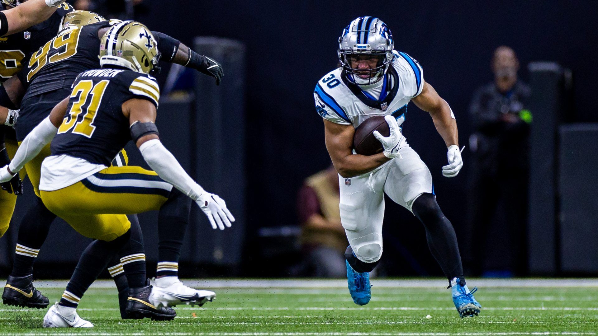 Dec 10, 2023; New Orleans, Louisiana, USA; Carolina Panthers running back Chuba Hubbard (30) rushes against New Orleans Saints safety Jordan Howden (31) during the first half at the Caesars Superdome. Mandatory Credit: Stephen Lew-USA TODAY Sports
