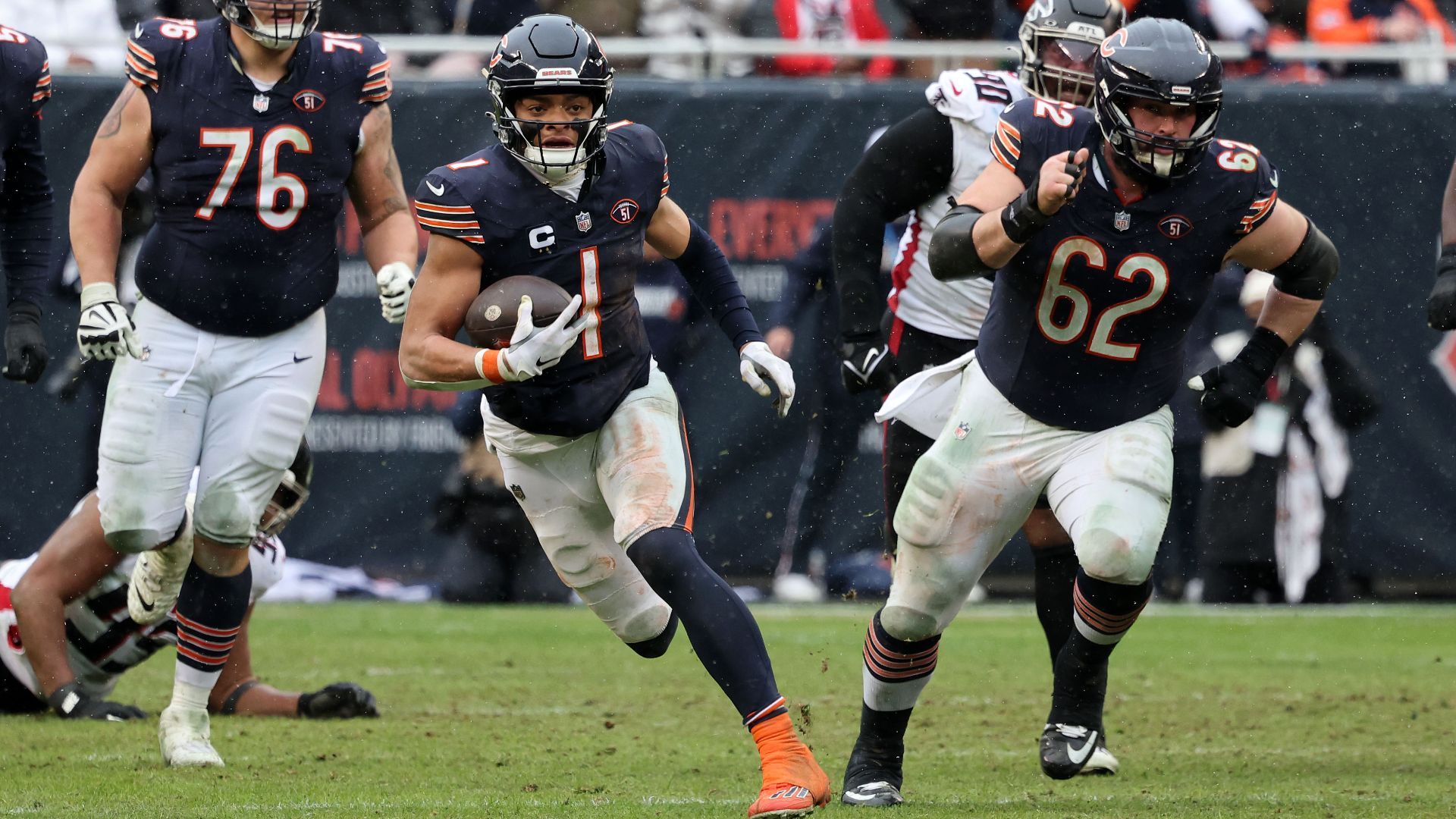 Dec 31, 2023; Chicago, Illinois, USA; Chicago Bears quarterback Justin Fields (1) rushes the ball against the Atlanta Falcons during the second half at Soldier Field. Mandatory Credit: Mike Dinovo-USA TODAY Sports