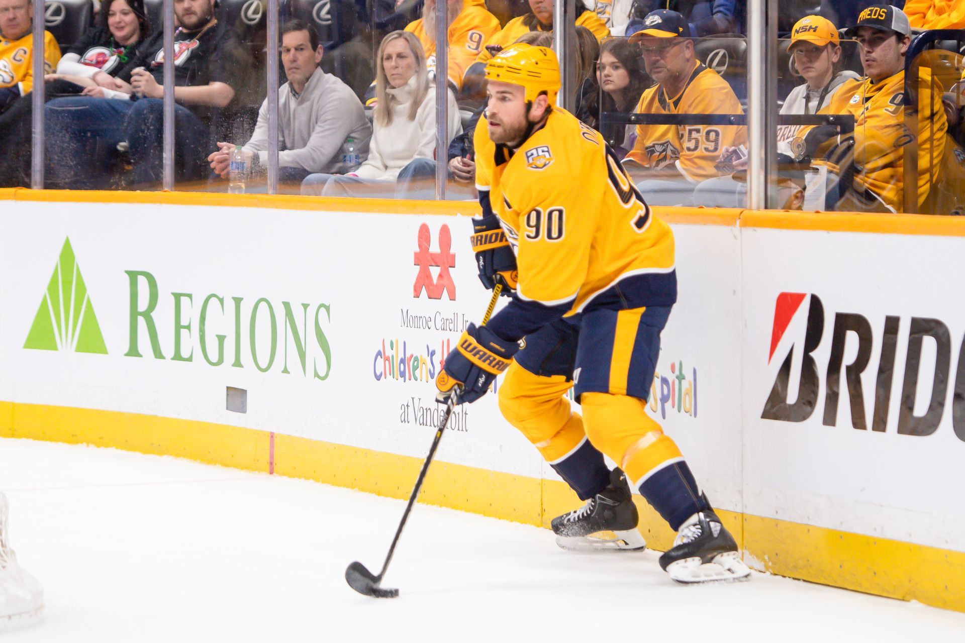 Feb 13, 2024; Nashville, Tennessee, USA; Nashville Predators center Ryan O'Reilly (90) stands with the puck behind the net against the New Jersey Devils during the first period at Bridgestone Arena. Mandatory Credit: Steve Roberts-USA TODAY Sports