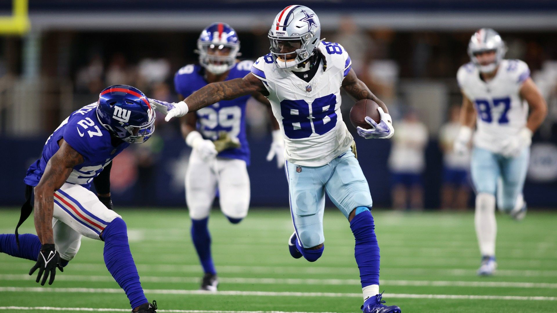 Nov 12, 2023; Arlington, Texas, USA; Dallas Cowboys wide receiver CeeDee Lamb (88) runs with the ball after catching a pass in the first quarter against the New York Giants at AT&T Stadium. Mandatory Credit: Tim Heitman-USA TODAY Sports