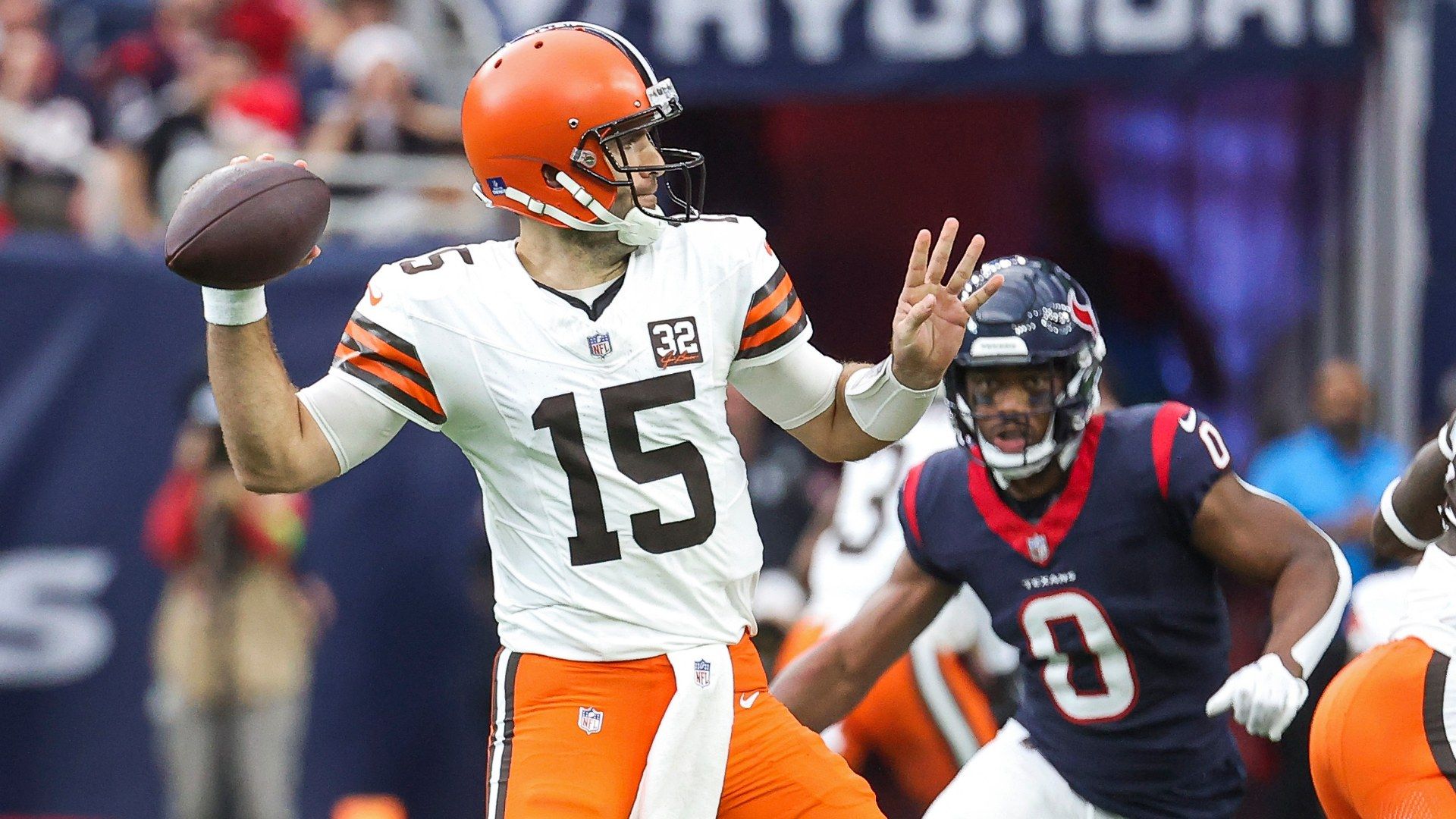 Dec 24, 2023; Houston, Texas, USA; Cleveland Browns quarterback Joe Flacco (15) attempts a pass during the fourth quarter against the Houston Texans at NRG Stadium. Mandatory Credit: Troy Taormina-USA TODAY Sports