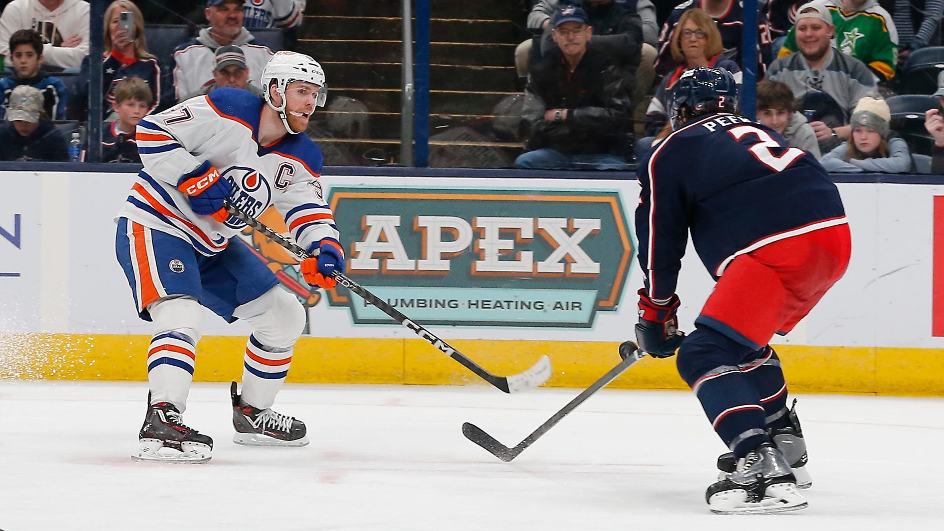Mar 7, 2024; Columbus, Ohio, USA; Columbus Blue Jackets defenseman Andrew Peeke (2) blocks the shot attempt of Edmonton Oilers center Connor McDavid (97) during the third period at Nationwide Arena. Mandatory Credit: Russell LaBounty-USA TODAY Sports