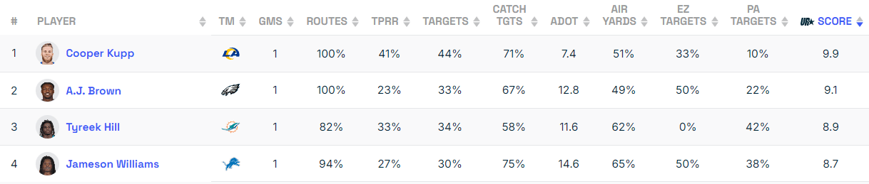When sorting by our brand-new Utilization Score (which is a metric to help predict future fantasy performance), you’ll notice his name alongside some absurd WR company: