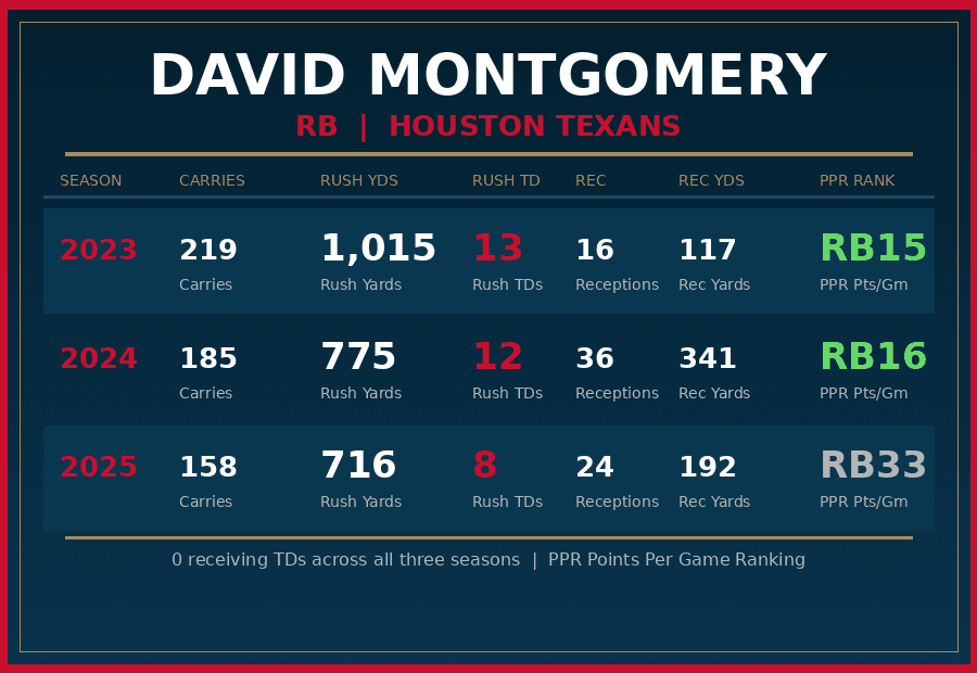 The 28-year-old veteran back did plenty of good things across his three seasons with the Lions, notably racking up a whopping 33 touchdowns on the ground from 2023-2025–the sixth-most among any running back. This accordingly led to plenty of fantasy points for Montgomery's loyal fantasy managers.