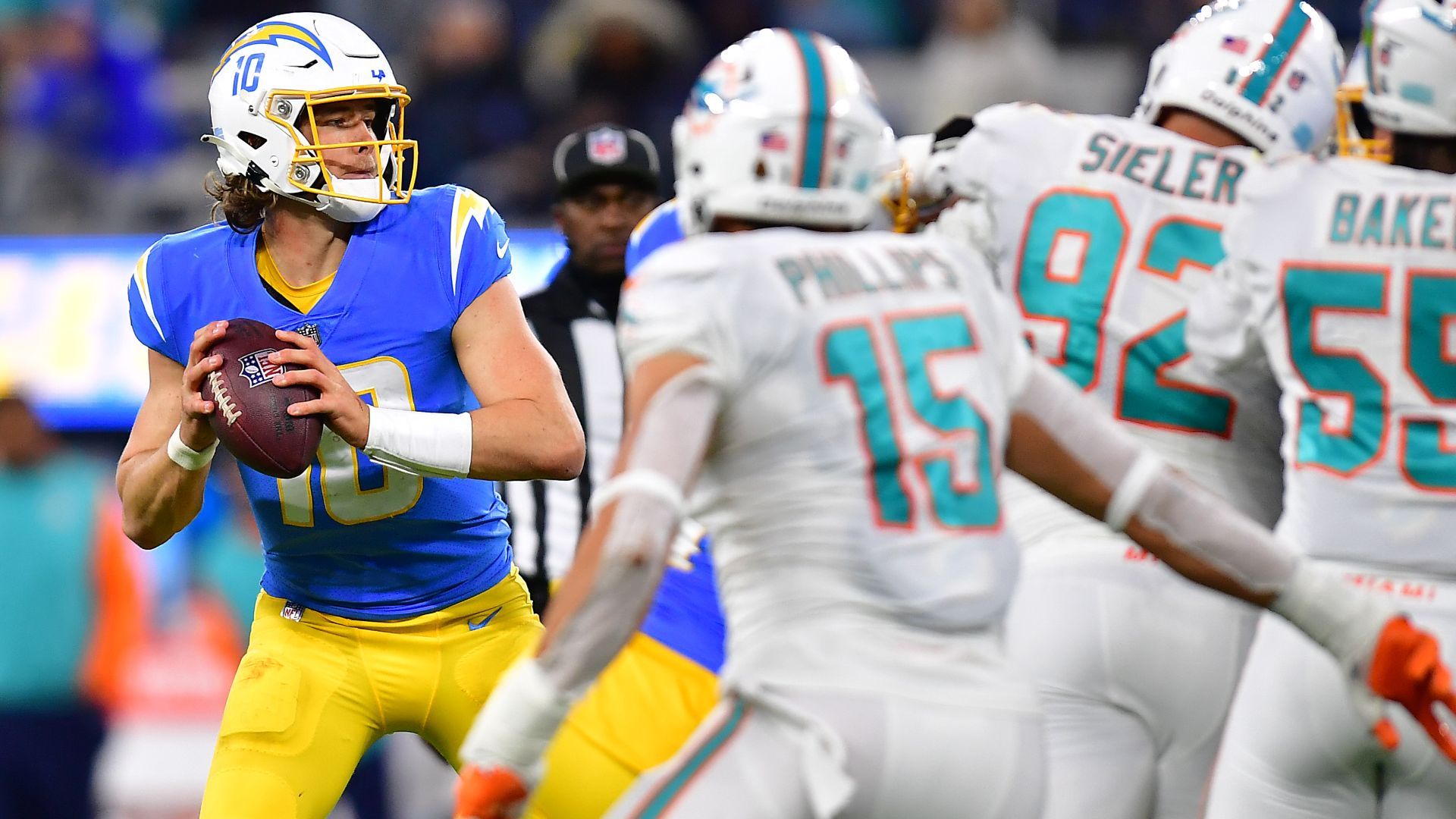 Dec 11, 2022; Inglewood, California, USA; Los Angeles Chargers quarterback Justin Herbert (10) drops back to pass against the Miami Dolphins during the second half at SoFi Stadium. Mandatory Credit: Gary A. Vasquez-USA TODAY Sports