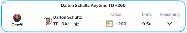 Tampaâs coverage against the TE position was terrible most of the season, especially in the red zone, as they allowed nine overall TDs to opposing TEs (the fifth-most in the league). Schultzâs anytime TD prop (which sits around +260 as of writing) is worth attacking, and he should be a pivotal player for Dallasâs hopes this week, as he was in their Week 1 loss to Tampa when he secured seven receptions on nine targets.Â