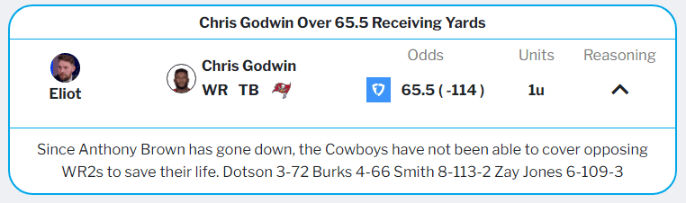 With Dallasâ corners hurting and their pass rush far less effective, Godwinâs over on his 67.5 yardage prop looks worth taking, and chasing him as a TD scorer in the first TD prop market or a single-game parlay also makes sense.
