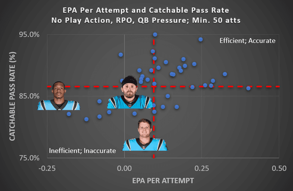 Quarterbacks can use play-action concepts and RPOs to keep defenses guessing. Plus, they have to have some level of mobility to evade pressure. All of which can affect their efficiency or ability to hit their targets in stride. So, I removed all those plays to see how the Carolina QBs performed when asked to play their position in its simplest form. Unfortunately, they couldn't.