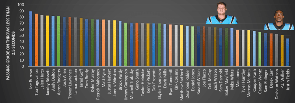 Darnold and Walker’s time-to-throw averages couldn’t have been starker. The XFL star averaged a blistering 2.27 seconds, while the Jets’ castoff needed an additional beat to get the ball out (3.22). Regardless, neither was successful. Both graded out poorly in PFF’s passing grades, and Walker had the sixth-highest pressure-to-sack ratio if he couldn’t find his first read. But here’s where good coaching will help the next QB for Carolina.