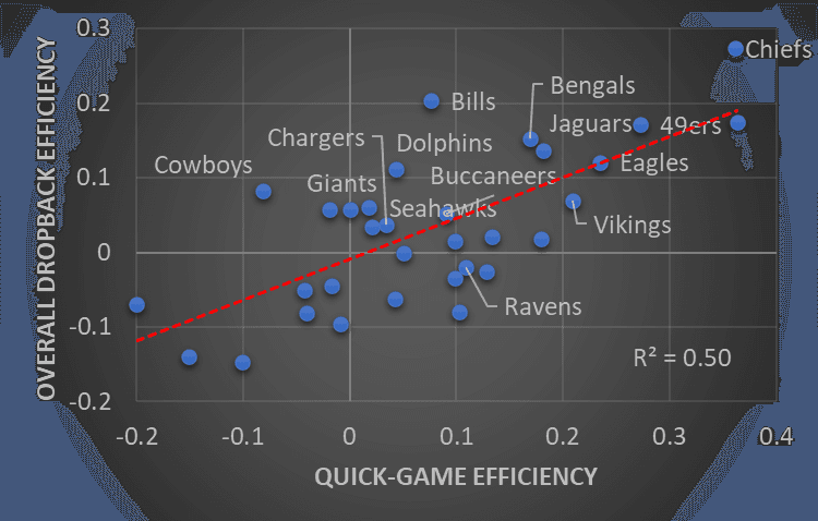 During the regular season, a team’s quick-game efficiency correlated with its overall dropback efficiency. That’s why the playoff teams litter the top-right section of the above chart. Moving the chains and creating explosive plays are byproducts of getting the ball out quickly. And, of course, the Panthers struggled here.
