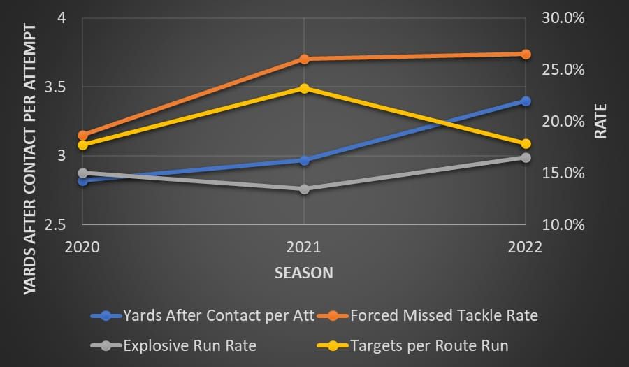 Jacobs was top 12 in almost every metric, from Rush Yards Over Expected to Forced Missed Tackles (min. 90 carries). Unsurprisingly, he hit a three-year high for most. All except for TPRR. In a season where Darren Waller and Hunter Renfrow missed a combined 15 games, Jacobs saw fewer targets on a per-route basis.