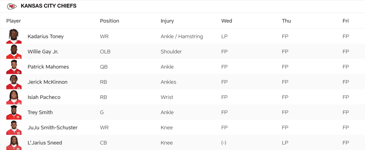 Injuries had been a dominant storyline for the Chiefs throughout the playoffs, but there is not a single player listed on their final injury report after Friday's practice with every player (including the banged up WRs) getting in a full practice: