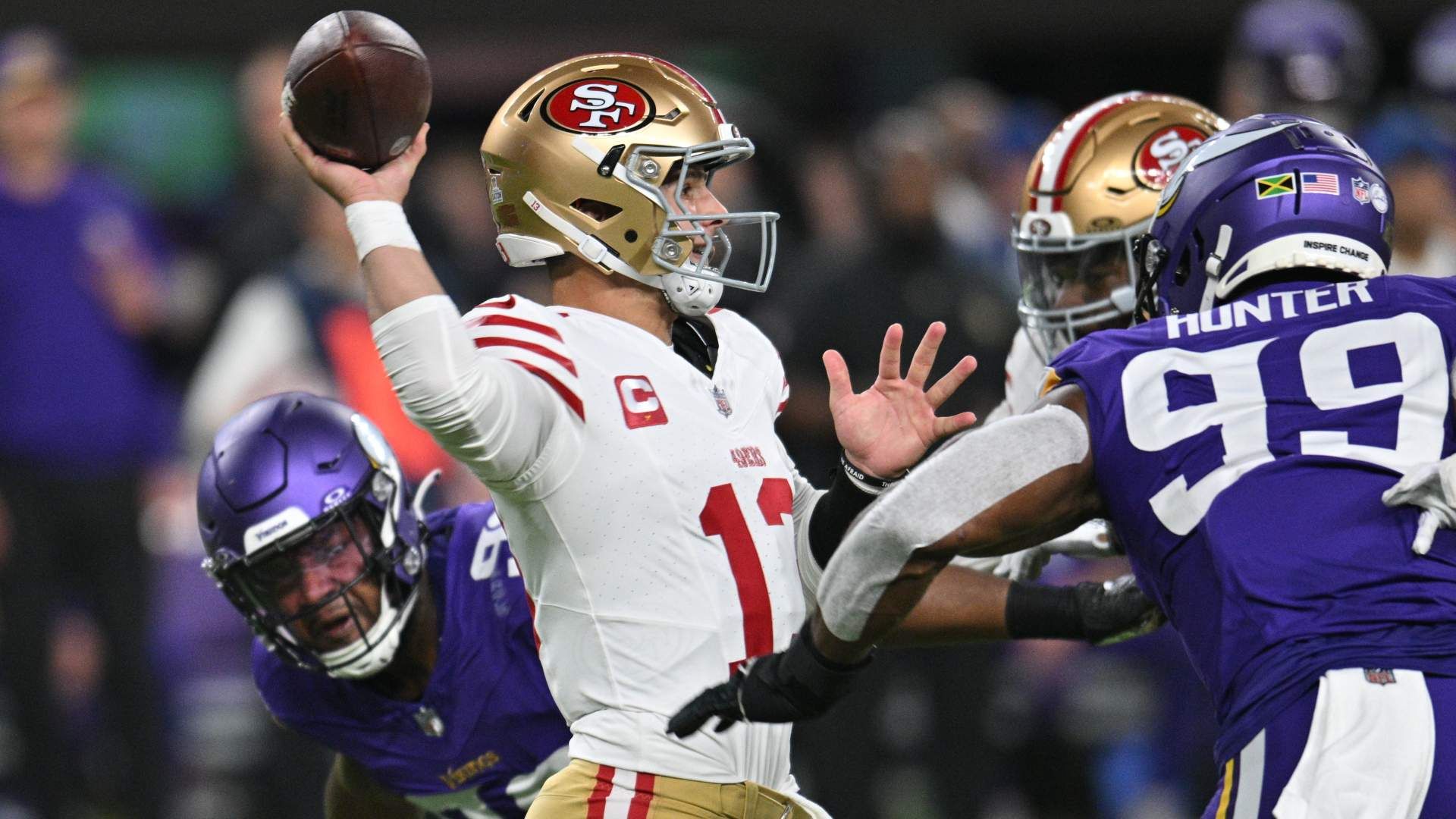 Oct 23, 2023; Minneapolis, Minnesota, USA; San Francisco 49ers quarterback Brock Purdy (13) throws a pass as Minnesota Vikings linebacker Danielle Hunter (99) and linebacker D.J. Wonnum (left) rush in during the first quarter at U.S. Bank Stadium. Mandatory Credit: Jeffrey Becker-USA TODAY Sports