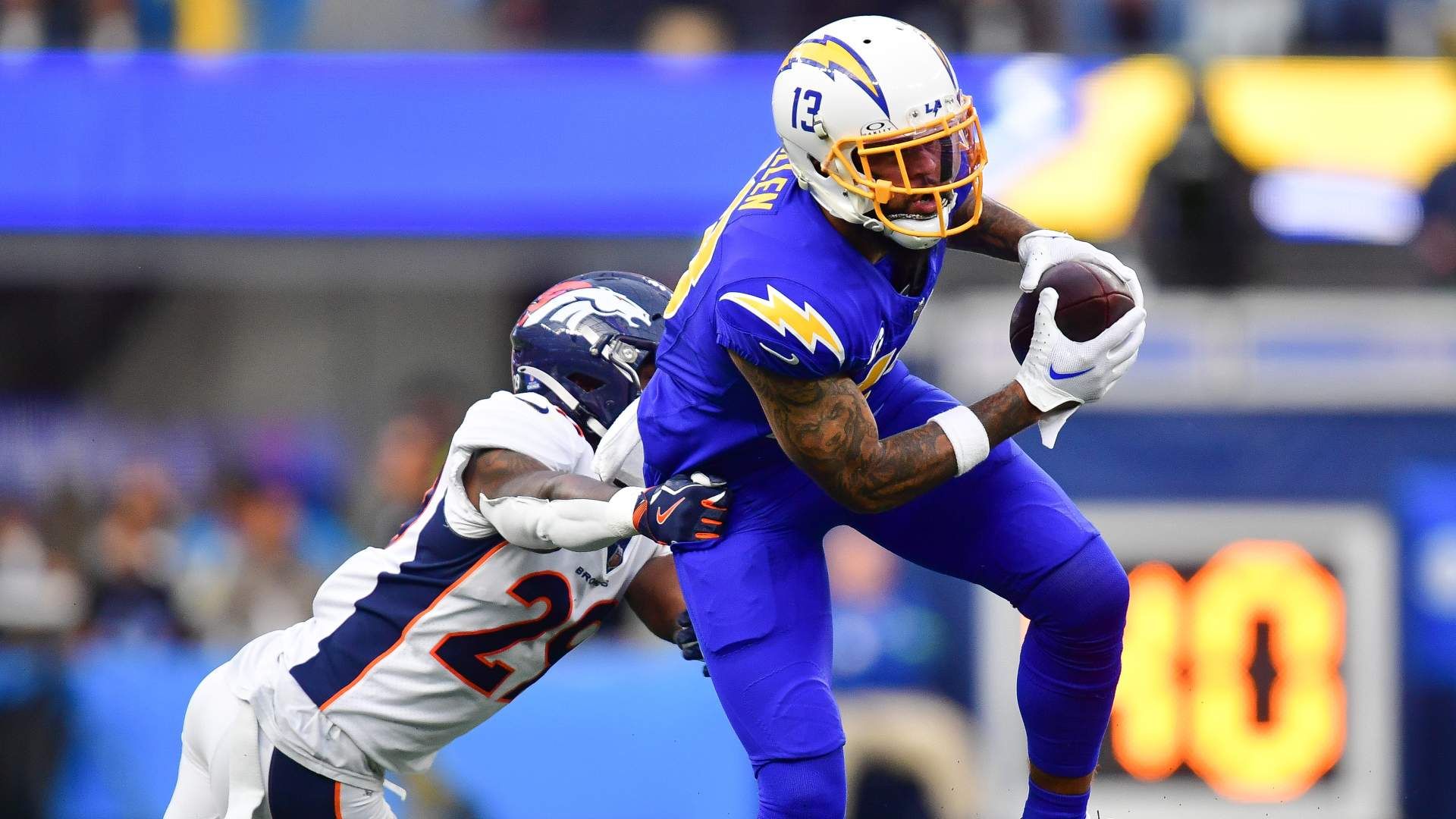 Dec 10, 2023; Inglewood, California, USA; Los Angeles Chargers wide receiver Keenan Allen (13) runs the ball ahead of Denver Broncos cornerback Ja'Quan McMillian (29) during the first half at SoFi Stadium. Mandatory Credit: Gary A. Vasquez-USA TODAY Sports