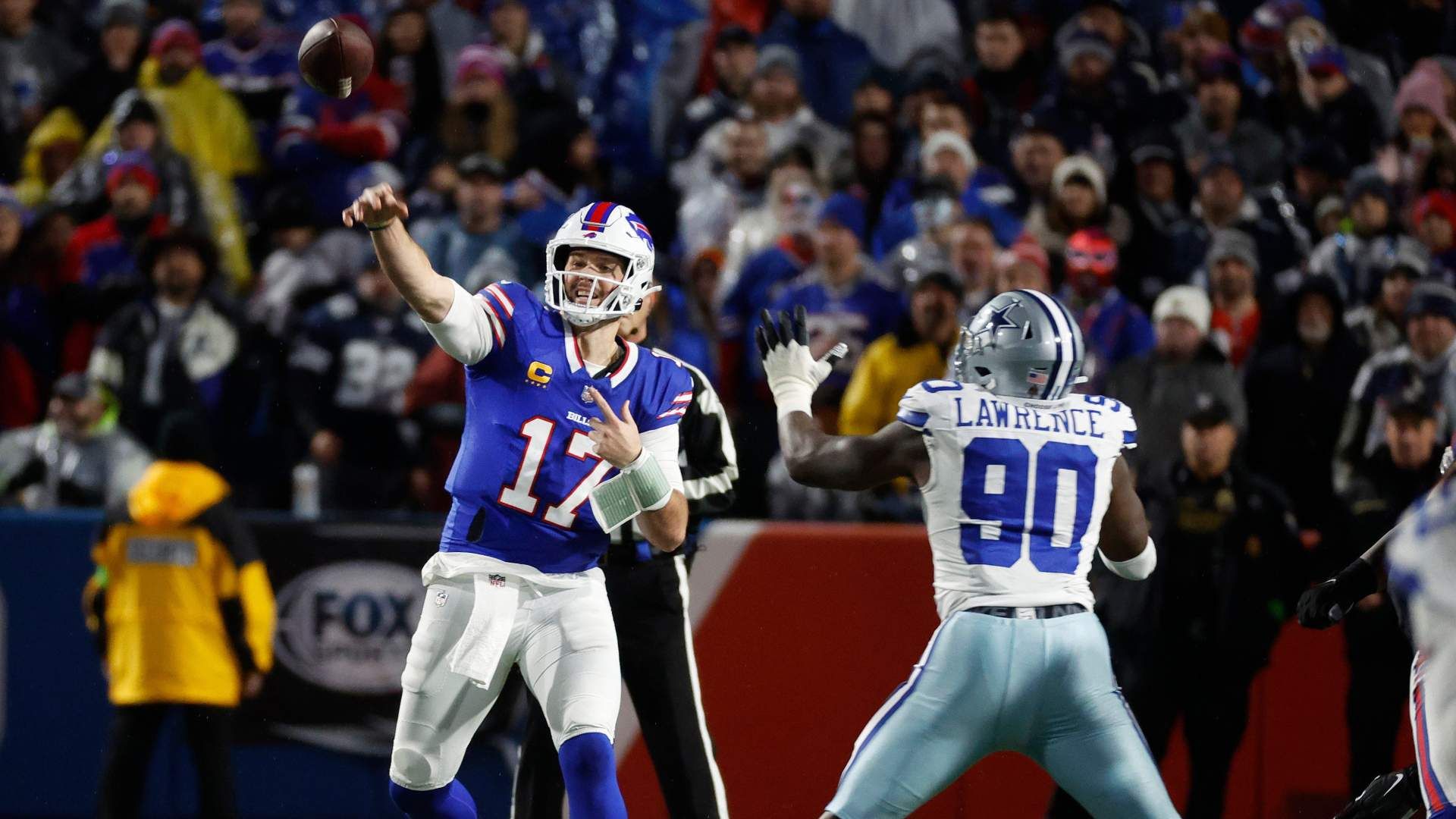 Buffalo Bills quarterback Josh Allen (17)throws deep as he is pressured by Dallas Cowboys defensive end DeMarcus Lawrence (90). Photo Credit: Jamie Germano/Rochester Democrat and Chronicle / USA TODAY NETWORK