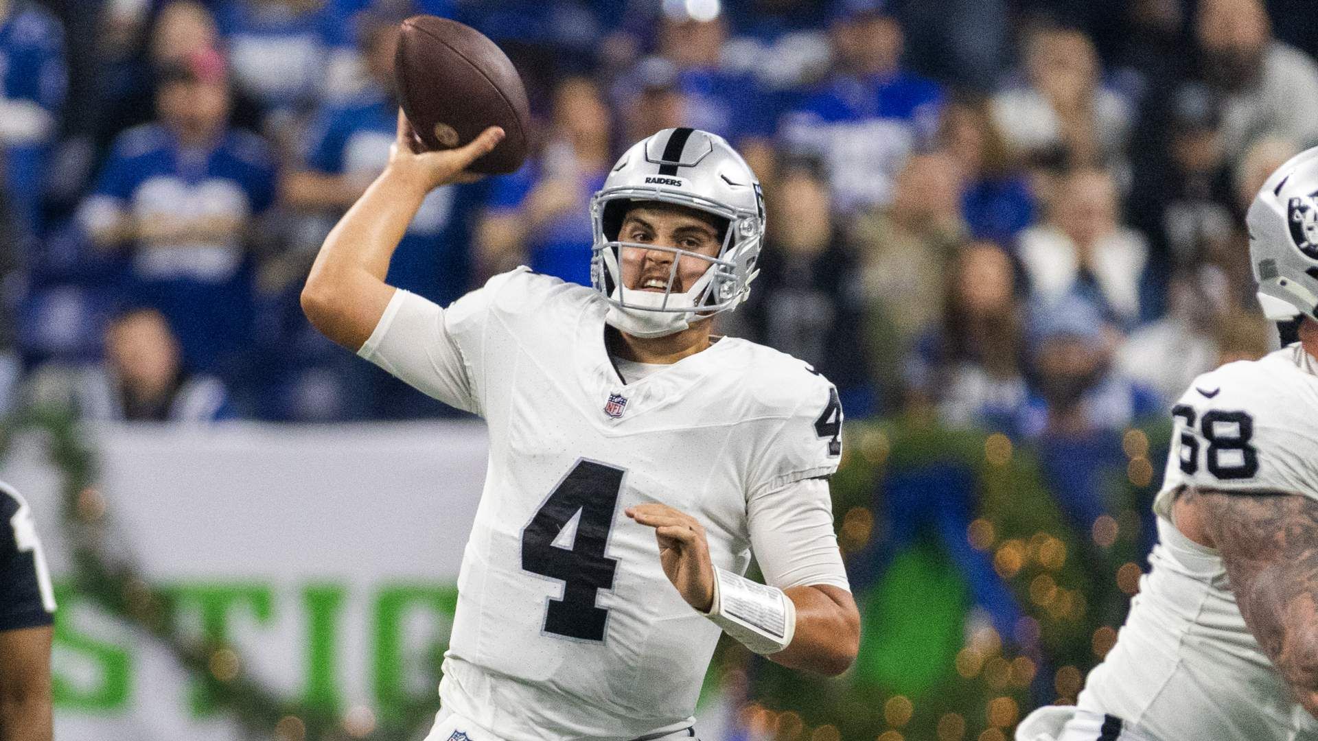 Dec 31, 2023; Indianapolis, Indiana, USA; Las Vegas Raiders quarterback Aidan O'Connell (4) passes the ball in the first half against the Indianapolis Colts at Lucas Oil Stadium. Mandatory Credit: Trevor Ruszkowski-USA TODAY Sports