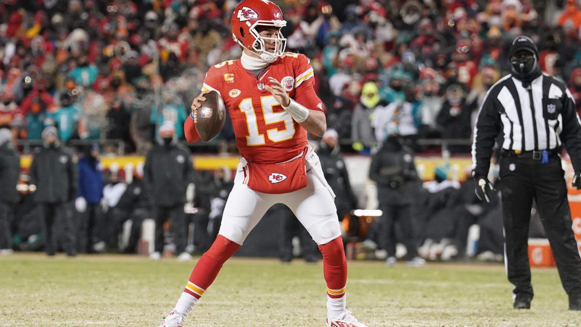 Jan 13, 2024; Kansas City, Missouri, USA; Kansas City Chiefs quarterback Patrick Mahomes (15) drops back to pass against the Miami Dolphins during the second half of the 2024 AFC wild card game at GEHA Field at Arrowhead Stadium. Mandatory Credit: Denny Medley-USA TODAY Sports