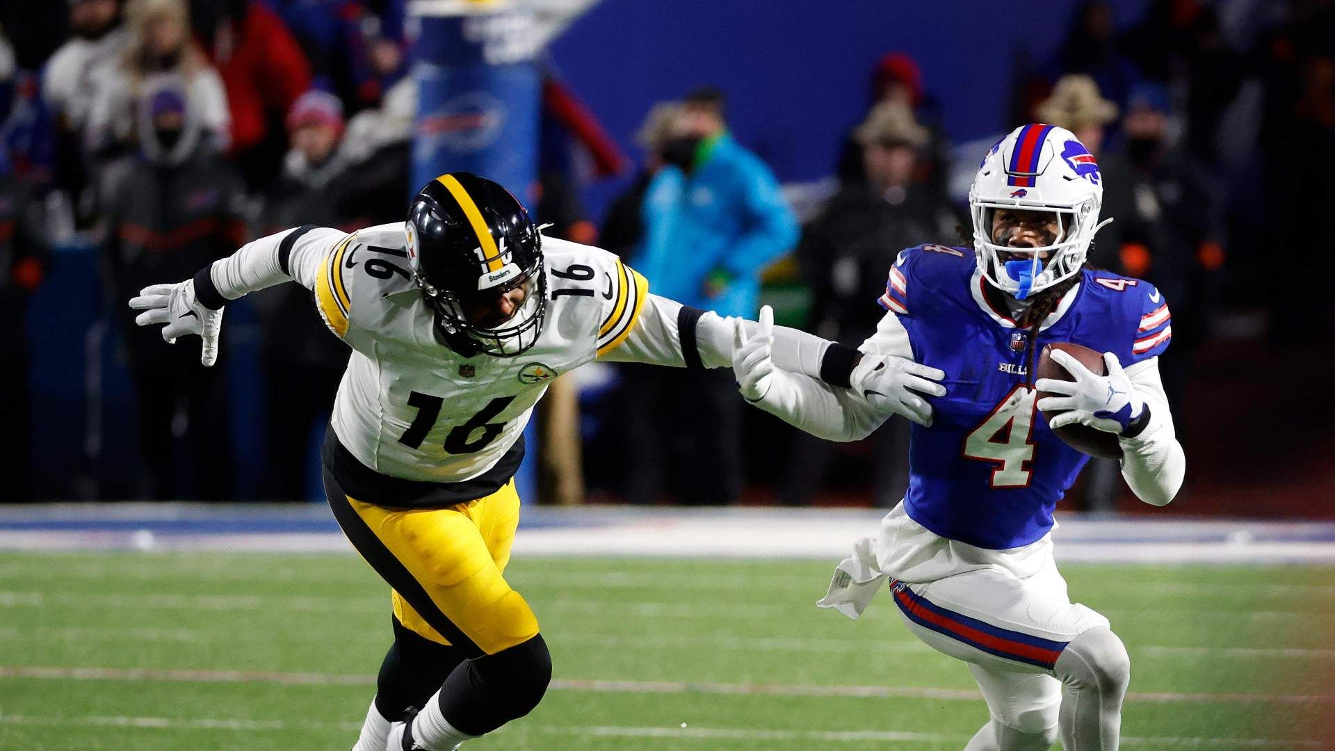 Buffalo Bills running back James Cook (4) slips tackle by Pittsburgh Steelers linebacker Myles Jack (16). Photo Credit: Jamie Germano/Rochester Democrat and Chronicle / USA TODAY NETWORK
