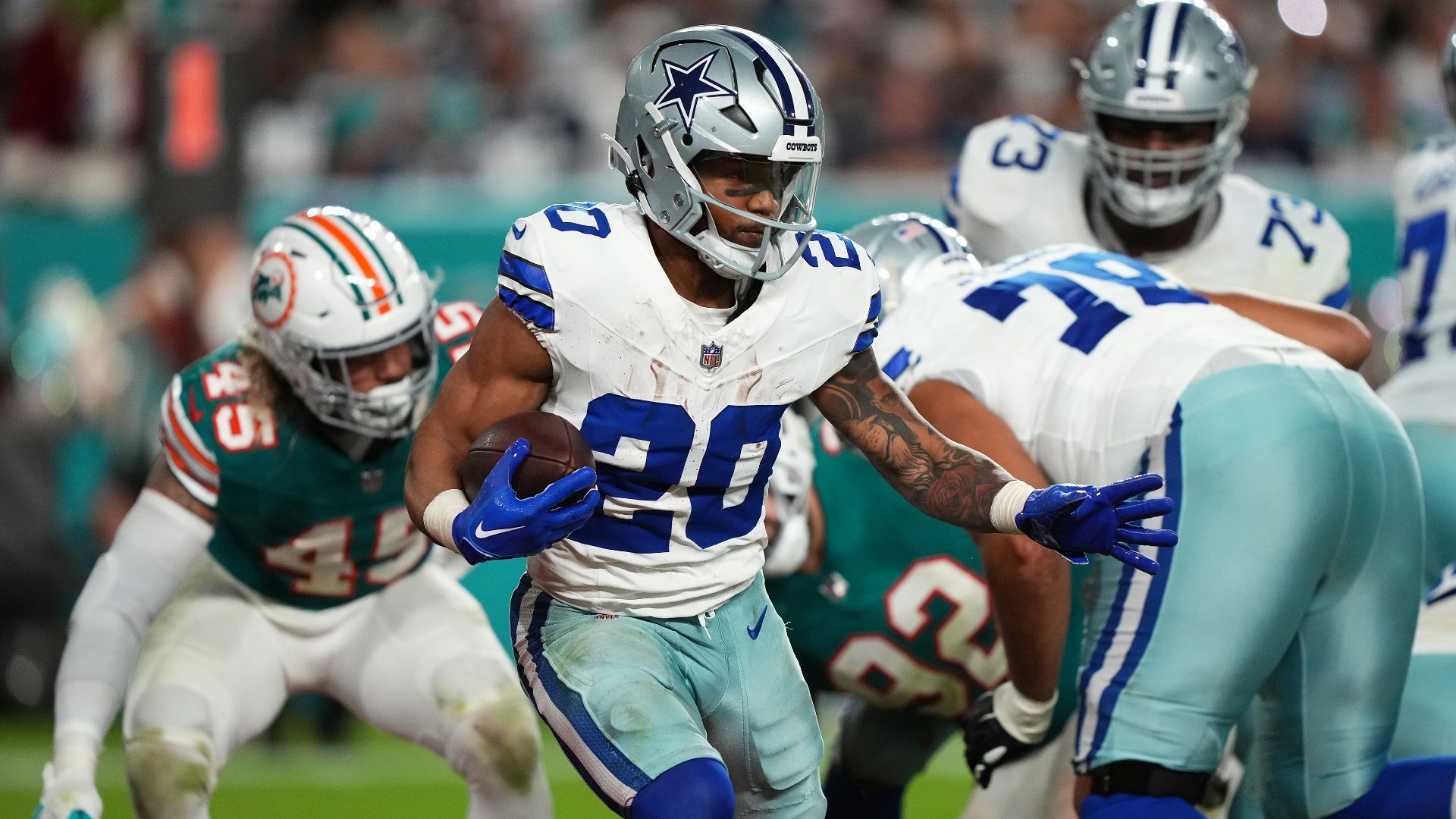 Dec 24, 2023; Miami Gardens, Florida, USA; Dallas Cowboys running back Tony Pollard (20) runs the ball against the Miami Dolphins during the second half at Hard Rock Stadium. Mandatory Credit: Jasen Vinlove-USA TODAY Sports