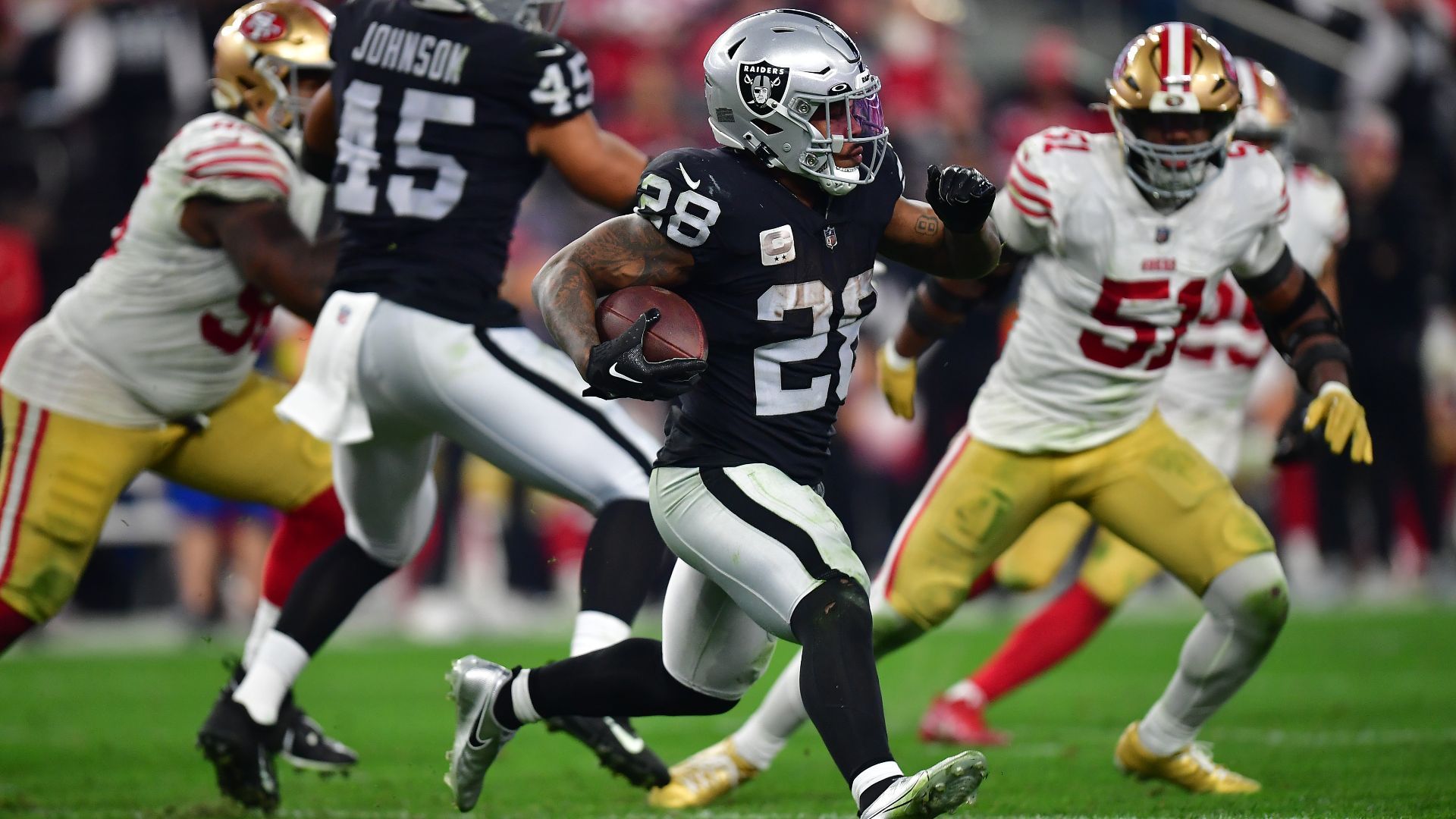 January 1, 2023; Paradise, Nevada, USA; Las Vegas Raiders running back Josh Jacobs (28) runs the ball against the San Francisco 49ers during overtime at Allegiant Stadium. Mandatory Credit: Gary A. Vasquez-USA TODAY Sports