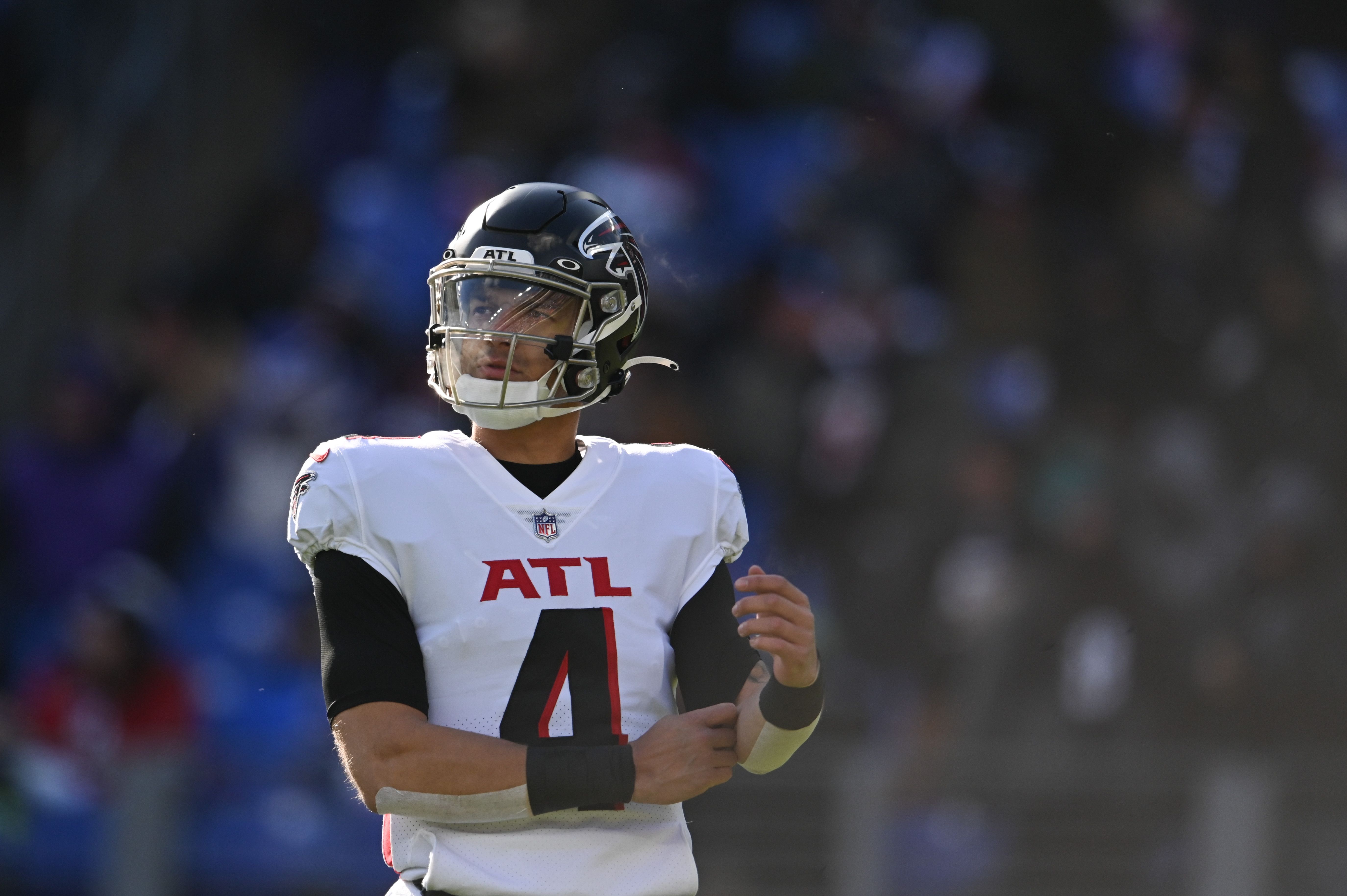 Dec 24, 2022; Baltimore, Maryland, USA; Atlanta Falcons quarterback Desmond Ridder (4) looks down fire during the first half against the Baltimore Ravens at M&T Bank Stadium. Mandatory Credit: Tommy Gilligan-USA TODAY Sports