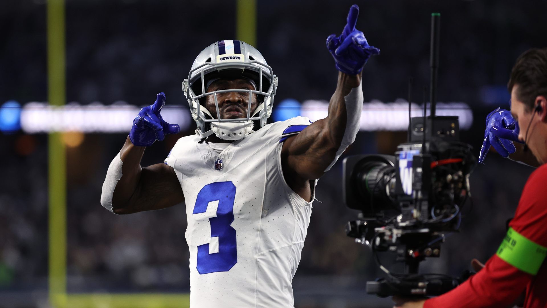 Nov 30, 2023; Arlington, Texas, USA; Dallas Cowboys wide receiver Brandin Cooks (3) celebrates after scoring a touchdown against the Seattle Seahawks during the first half at AT&T Stadium. Mandatory Credit: Tim Heitman-USA TODAY Sports