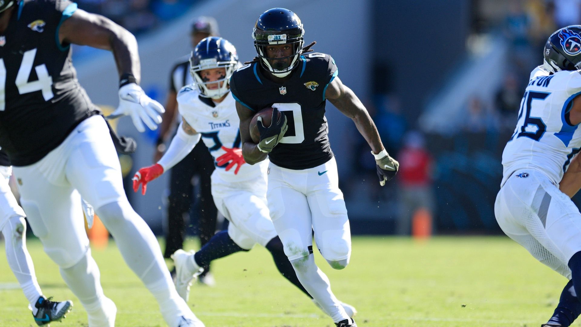 Jacksonville Jaguars wide receiver Calvin Ridley (0) rushes for yards during the second quarter an NFL football matchup Sunday, Nov. 19, 2023 at EverBank Stadium in Jacksonville, Fla. The Jacksonville Jaguars defeated the Tennessee Titans 34-14. [Corey Perrine/Florida Times-Union]