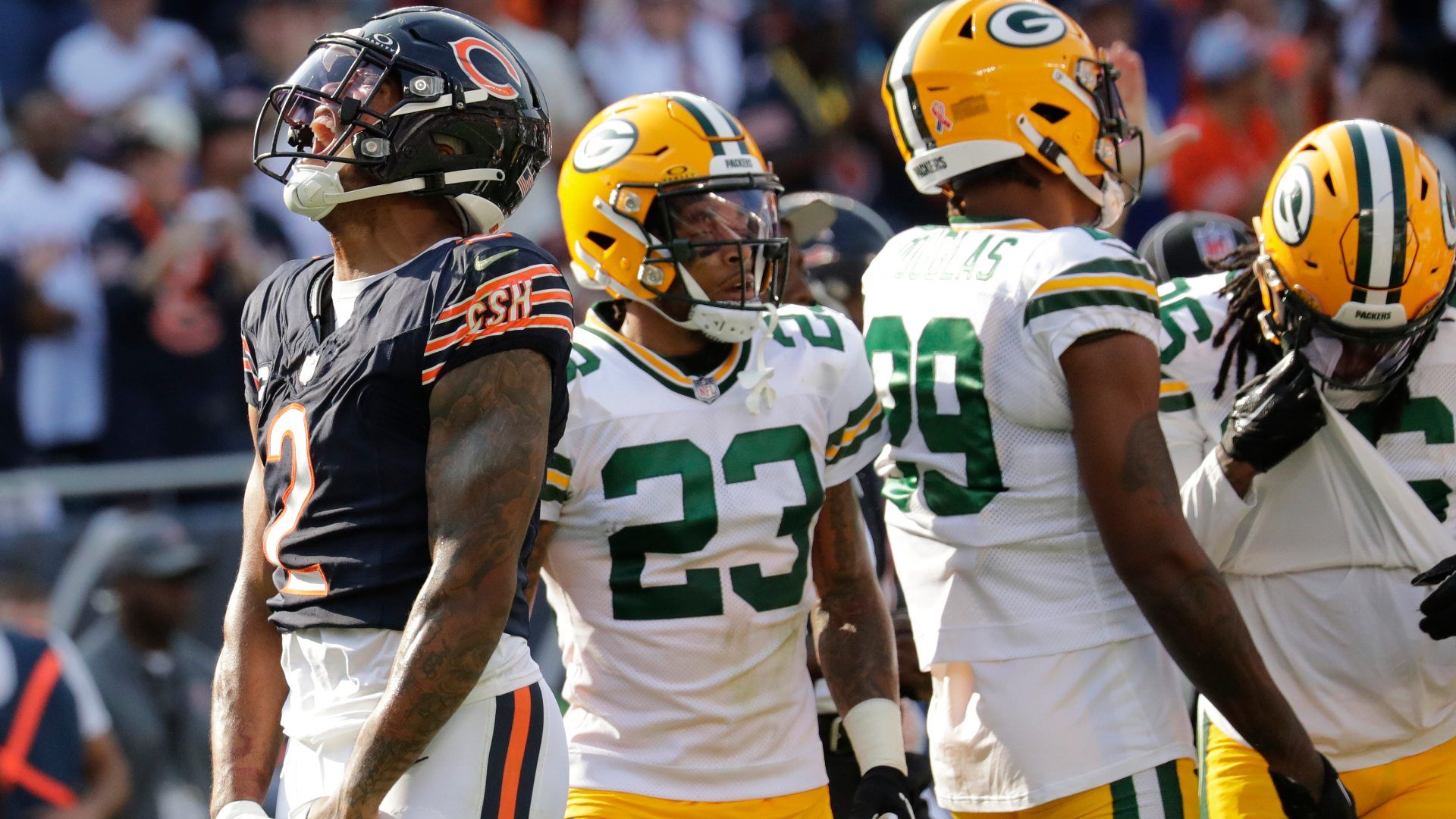 Sep 10, 2023; Chicago, Illinois, USA; Chicago Bears wide receiver DJ Moore (2) celebrates a first down run against the Green Bay Packers during their football game at Soldier Field. Mandatory Credit: Dan Powers-USA TODAY Sports