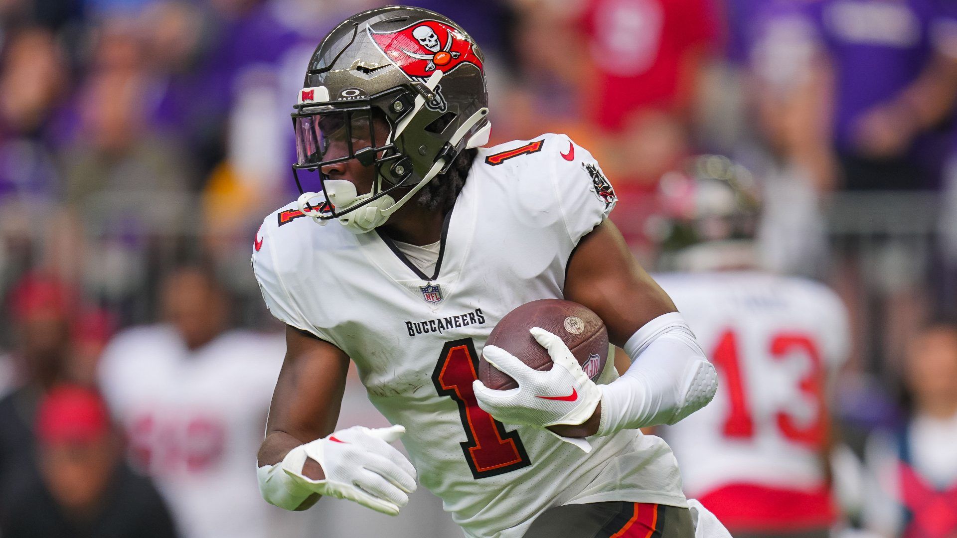 Sep 10, 2023; Minneapolis, Minnesota, USA; Tampa Bay Buccaneers running back Rachaad White (1) runs with the ball against the Minnesota Vikings in the second quarter at U.S. Bank Stadium. Mandatory Credit: Brad Rempel-USA TODAY Sports