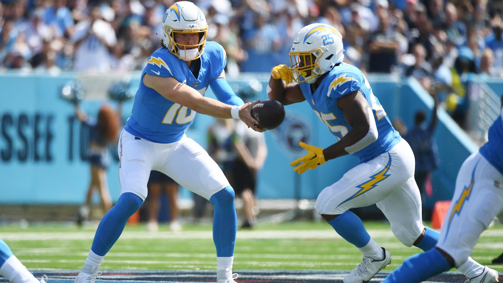 Sep 17, 2023; Nashville, Tennessee, USA; Los Angeles Chargers quarterback Justin Herbert (10) hands the ball off to running back Joshua Kelley (25) during the first half against the Tennessee Titans at Nissan Stadium. Mandatory Credit: Christopher Hanewinckel-USA TODAY Sports