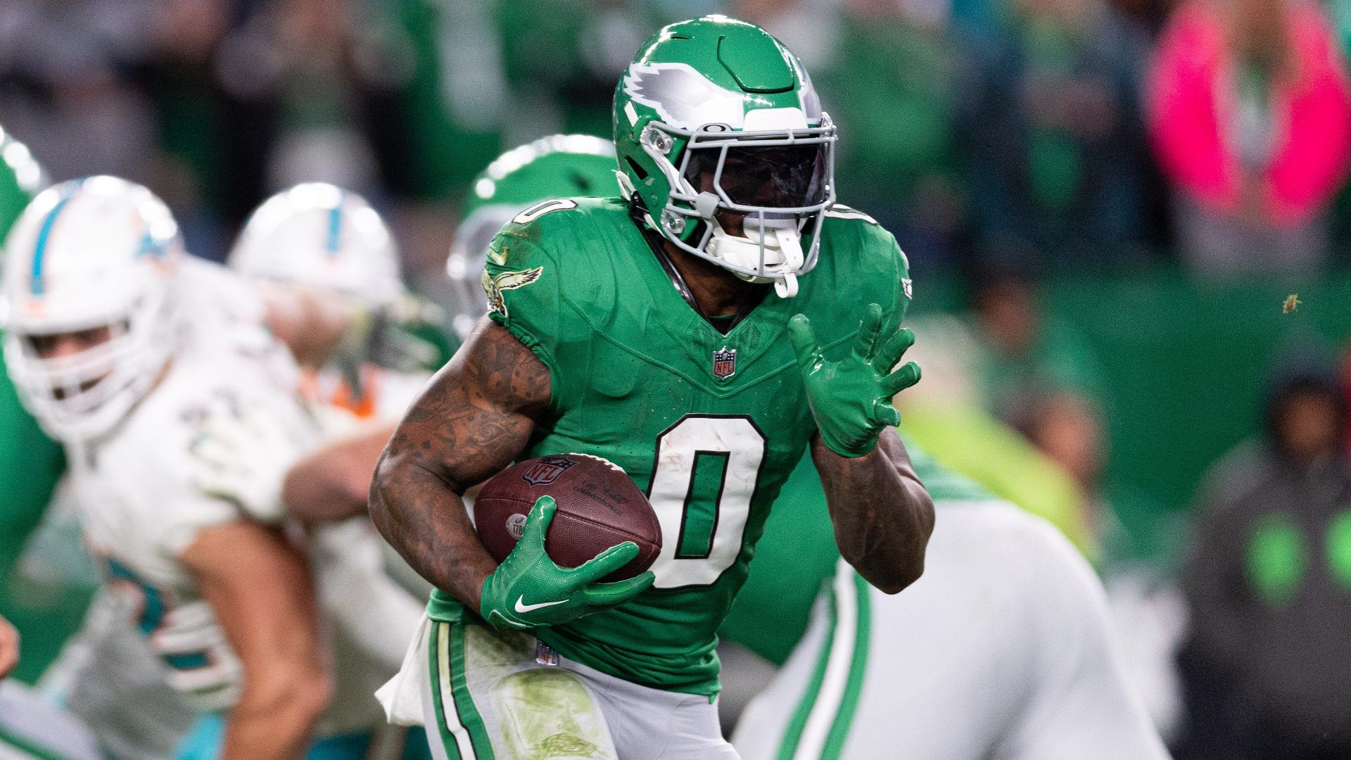 Oct 22, 2023; Philadelphia, Pennsylvania, USA; Philadelphia Eagles running back D'Andre Swift (0) runs with the ball against the Miami Dolphins during the fourth quarter at Lincoln Financial Field. Mandatory Credit: Bill Streicher-USA TODAY Sports