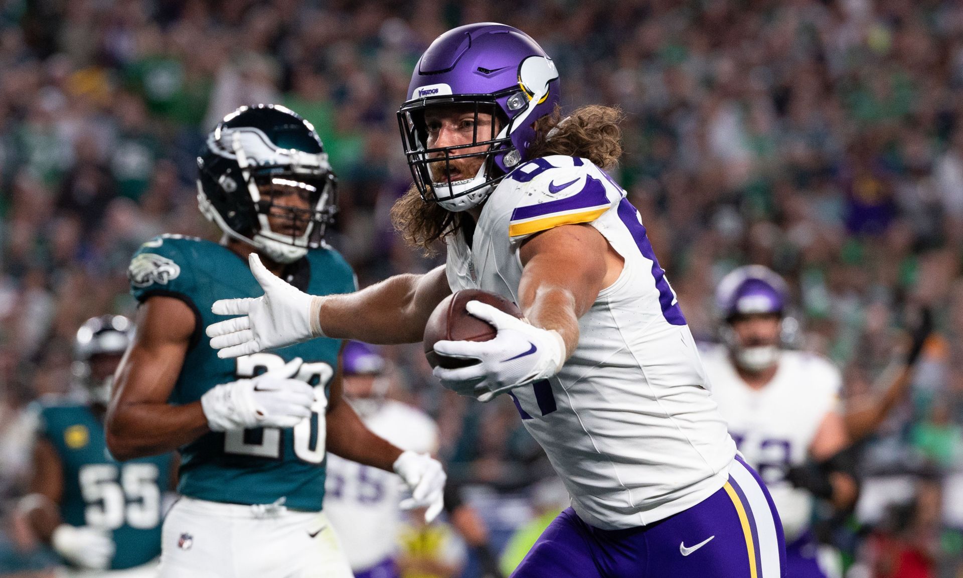 Sep 14, 2023; Philadelphia, Pennsylvania, USA; Minnesota Vikings tight end T.J. Hockenson (87) scores a touchdown after a catch against the Philadelphia Eagles during the second quarter at Lincoln Financial Field. Mandatory Credit: Bill Streicher-USA TODAY Sports