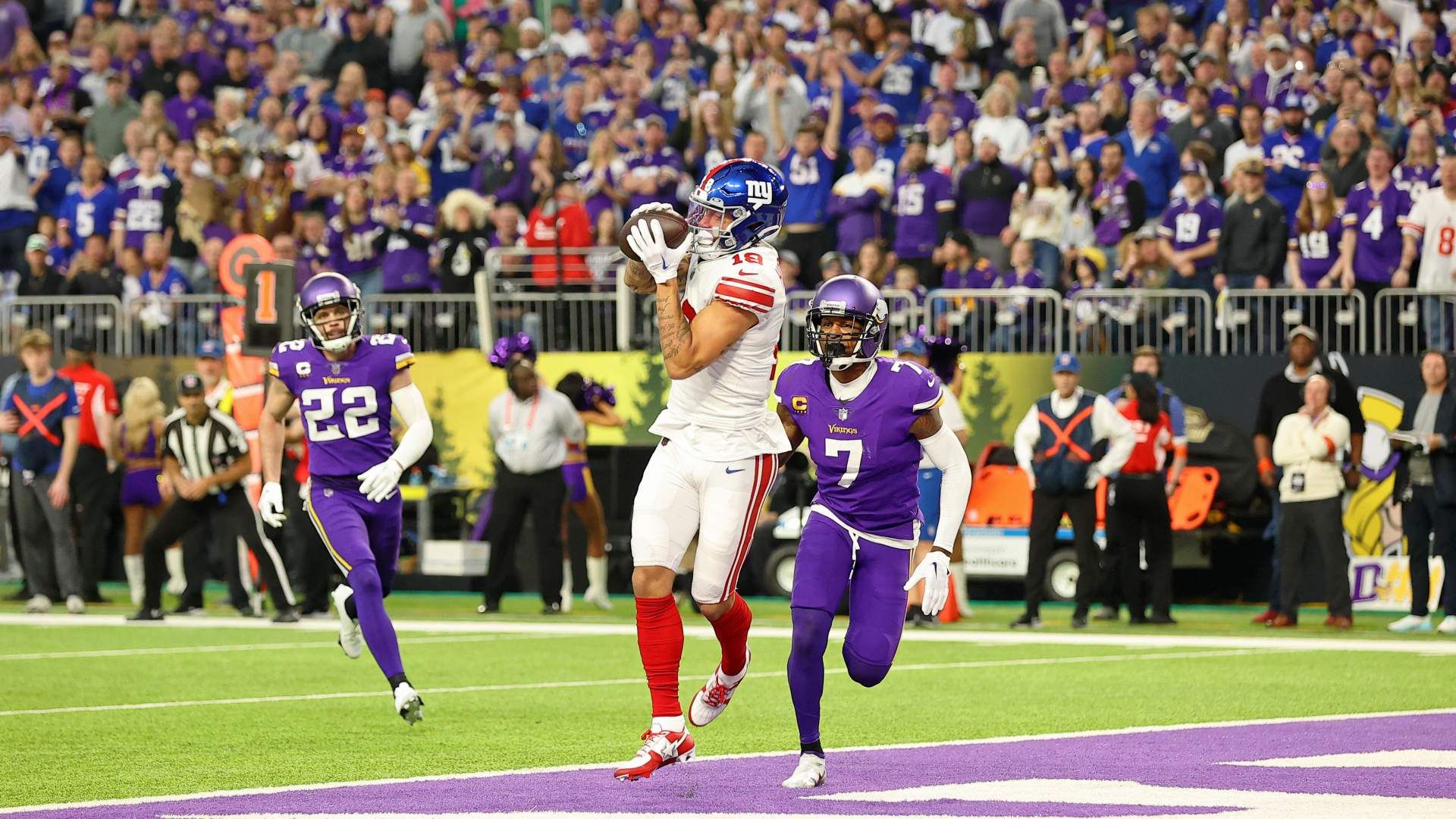 Jan 15, 2023; Minneapolis, Minnesota, USA; New York Giants wide receiver Isaiah Hodgins (18) makes a catch for a touchdown against the Minnesota Vikings during the first quarter of a wild card game at U.S. Bank Stadium. Mandatory Credit: Matt Krohn-USA TODAY Sports