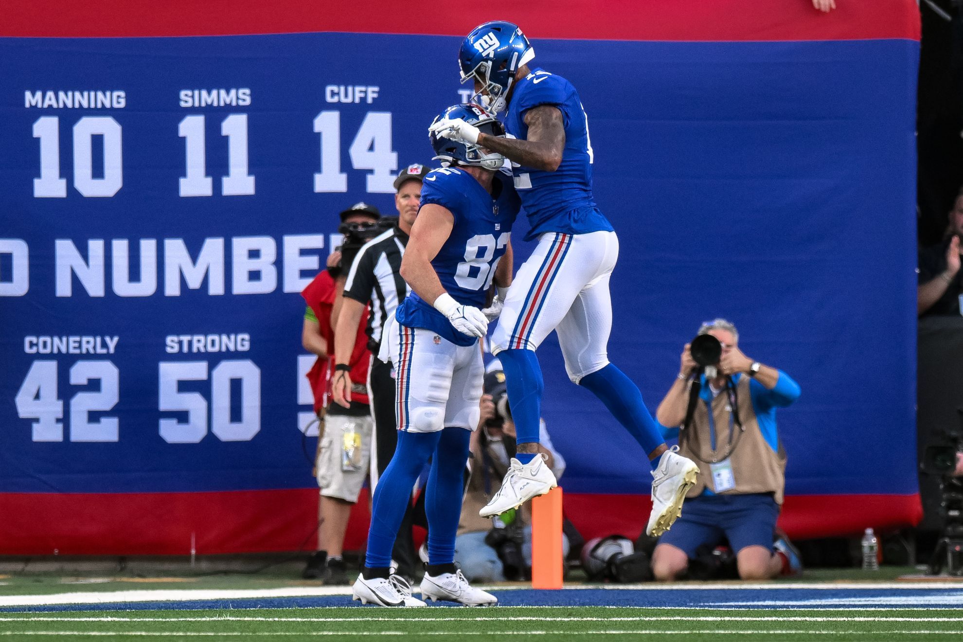 Aug 18, 2023; East Rutherford, New Jersey, USA; New York Giants tight end Daniel Bellinger (82) celebrates with New York Giants tight end Darren Waller (12) after catching a touchdown pass against the Carolina Panthers during the first quarter at MetLife Stadium. Mandatory Credit: John Jones-USA TODAY Sports