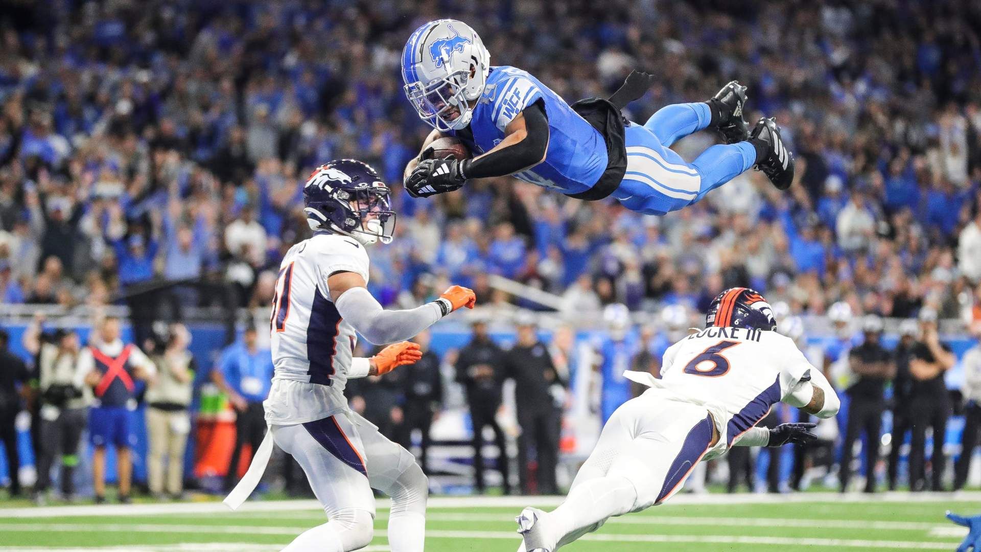 Detroit Lions wide receiver Amon-Ra St. Brown dives for a touchdown against Denver Broncos safety P.J. Locke during the first half at Ford Field in Detroit on Saturday, Dec. 16, 2023. Photo Credit: Junfu Han / USA TODAY NETWORK