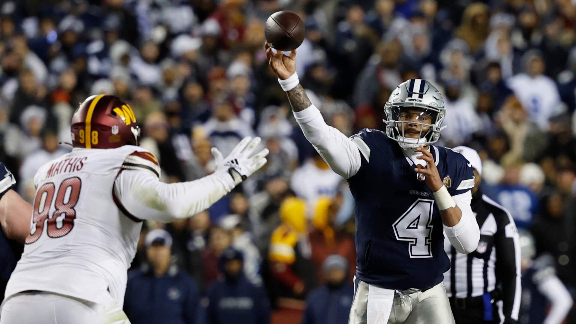 Jan 7, 2024; Landover, Maryland, USA; Dallas Cowboys quarterback Dak Prescott (4) passes the ball as Washington Commanders defensive tackle Phidarian Mathis (98) defends during the fourth quarter at FedEx Field. Mandatory Credit: Geoff Burke-USA TODAY Sports